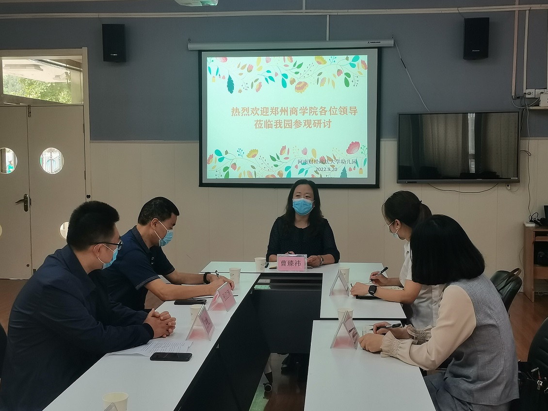 双方首先来到会议室进行座谈交流,河南财经政法大学附属幼儿园园长曹臻祎对张助理一行的到来表示热烈欢迎,并就幼儿园的发展现状、师资力量及课程体系等详细介绍。她表示,希望能和校方达成一系列合作,长期形成合作关系,建立实习实训基地。