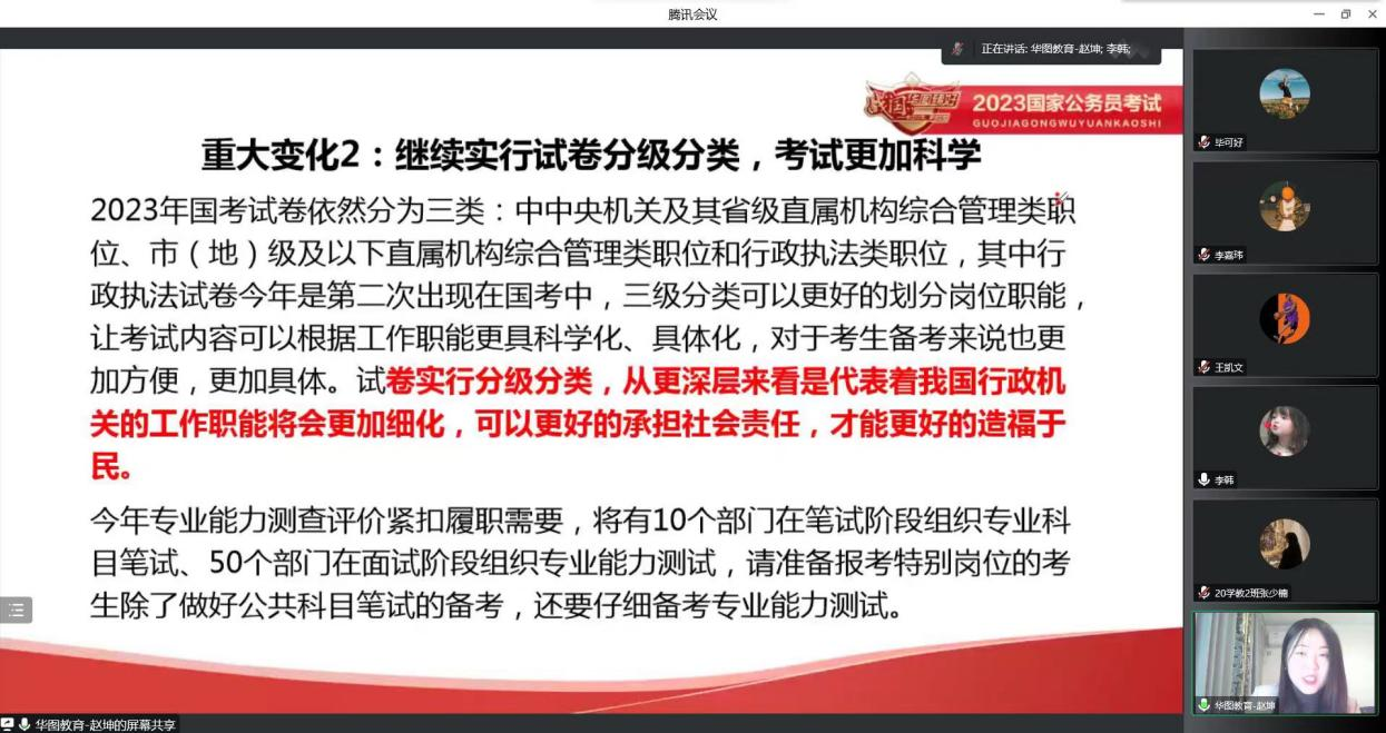 赵坤老师常年立足于公考讲座的第一线,本次讲座分为三部分。第一部分为2023年国考公告解读,分别从2023年就业选择、2023年国考公告变化、2023年国考公告详细解读、2023年国考河南公告解读四个方面分别进行阐述,详细地介绍了今年国考所发生的变化。第二部分为岗位报考指导,分别从2023最新数据分析、2022上岸分数回顾、2023国考报岗指导三方面进行阐述,详细的分析了数据内容并做出了相关指导。第三部分为报岗指导答疑,从考勤考务类和常见问题类两个方面进行讲解,内容包括国考考试时间内容地点分数以及突发的情况等。最后,针对同学们提出的疑问,赵坤老师一一做出了细心解答。同是,赵坤老师也表达了自己对同学们的期望。