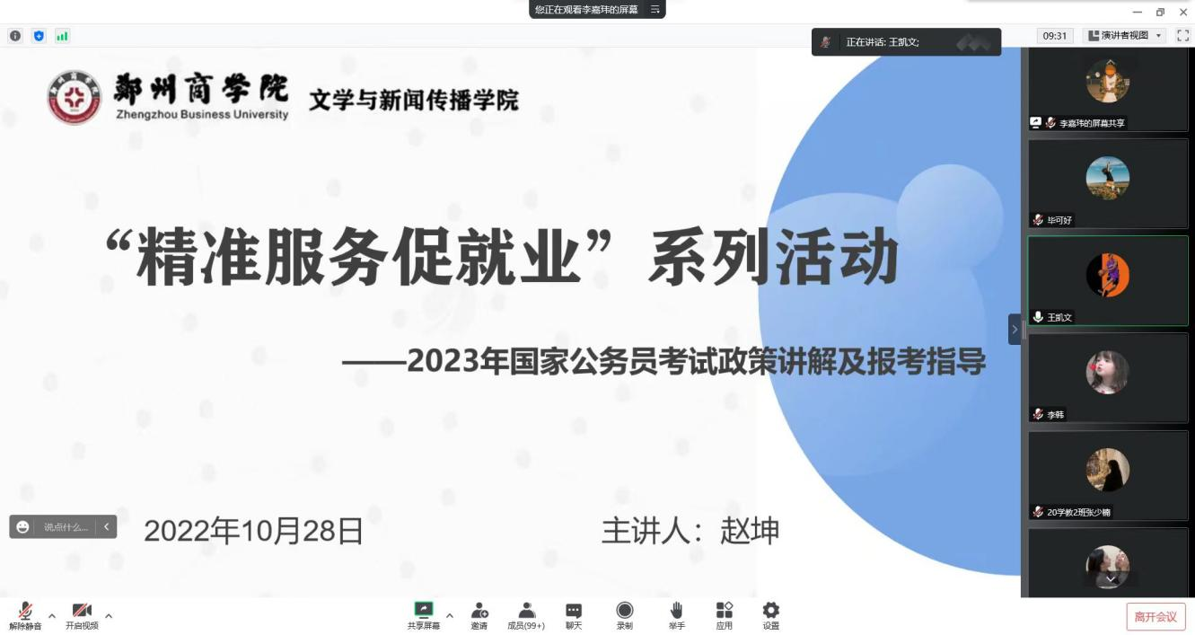 为加强我院学子对国家公务员考试的了解,帮助我院学子更加科学、全面地了解国家公务员考试政策。10月28日18时,我院开展2023年国家公务员考试政策解读及报考指导讲座。本次讲座由文传学院就业专员王凯文老师主持。