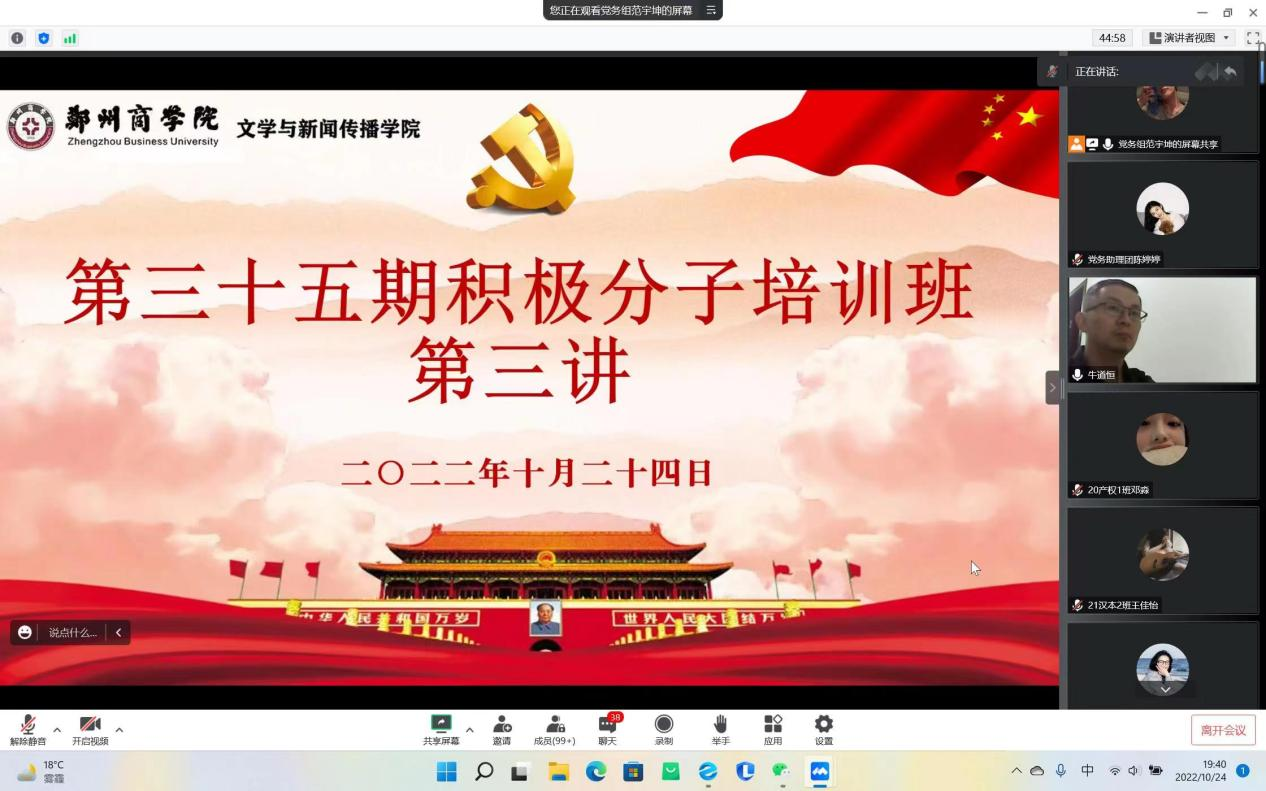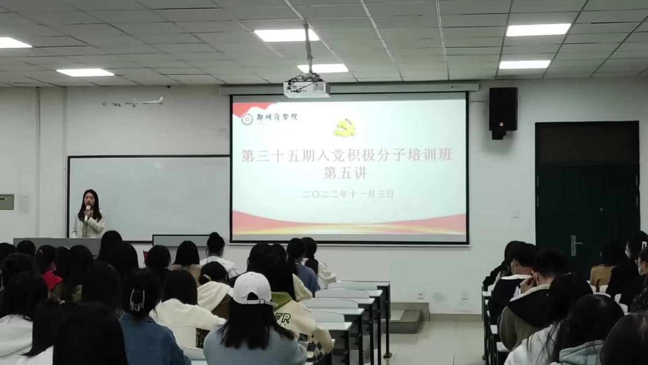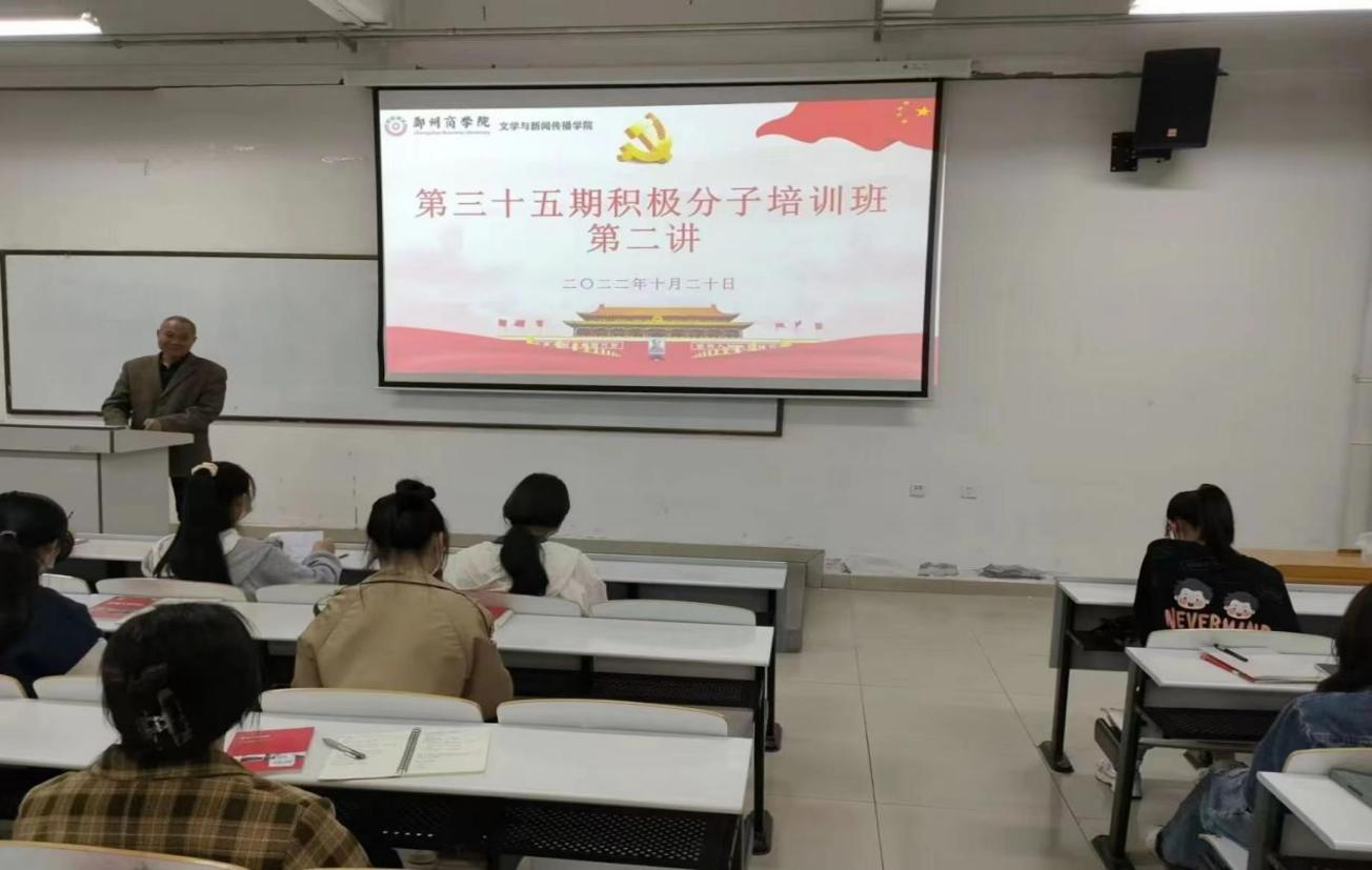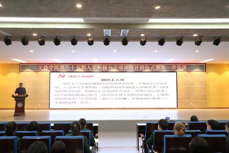 为进一步提升入党积极分子的理论水平,深入学习习近平新时代中国特色社会主义思想,贯彻党的二十大精神、党的十九届历次全会精神,认真贯彻落实习近平总书记关于教育的重要论述,强化对党的性质、纲领、宗旨、组织原则和纪律等方面学习,懂得党员的义务和权利。文传学院根据校党委工作部署,结合学院党建工作实际,于10月14日-11月3日,精心安排课程,圆满完成第35期入党积极分子培训工作。