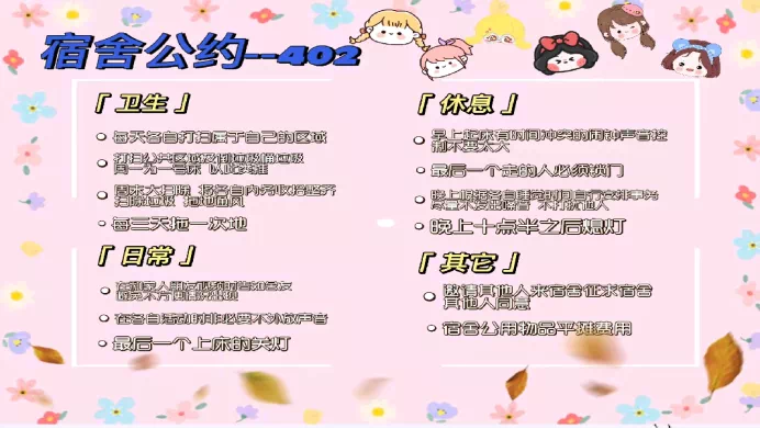 同学们在本次大赛中,发挥自己的丰富想象,在制作公约的过程中贯彻三大教育、两大工程理念,制定出属于自己宿舍的约定。