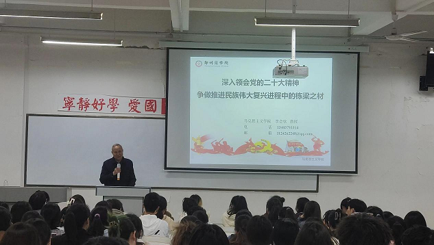 党课第一讲由马克思主义学院李会钦教授主讲,他以“深入领会党的二十大精神 争做推进民族伟大复兴进程中的栋梁之材”为主题,主要从“党的二十大精神的科学范畴、党的二十大精神的鲜明特质、党的二十大精神的丰富内涵、争做推进民族复兴的栋梁之材”四个层面介绍了党的二十大精神的“五个新”特质,讲述了二十大以来我国的伟大变革和新使命及马克思主义中国化时代化新境界。用通俗易懂的语言、生动形象的事例对党的二十大精神进行了深刻诠释和详细解读,引导学员们做推进民族伟大复兴进程中的栋梁之材。