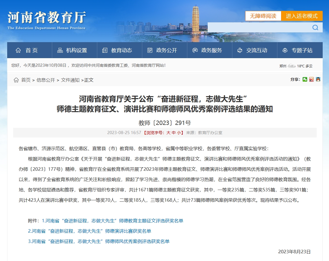 近日,河南省教育厅发布《“奋进新征程,志做大先生”师德主题教育征文、演讲比赛和师德师风优秀案例评选结果的通知》(教师〔2023〕291号),文传学子积极参与,在师德演讲比赛中学生组荣获二等奖2项,三等奖1项。在师德教育主题征文评选中学生组荣获一等奖1项,二等奖1项,三等奖2项。