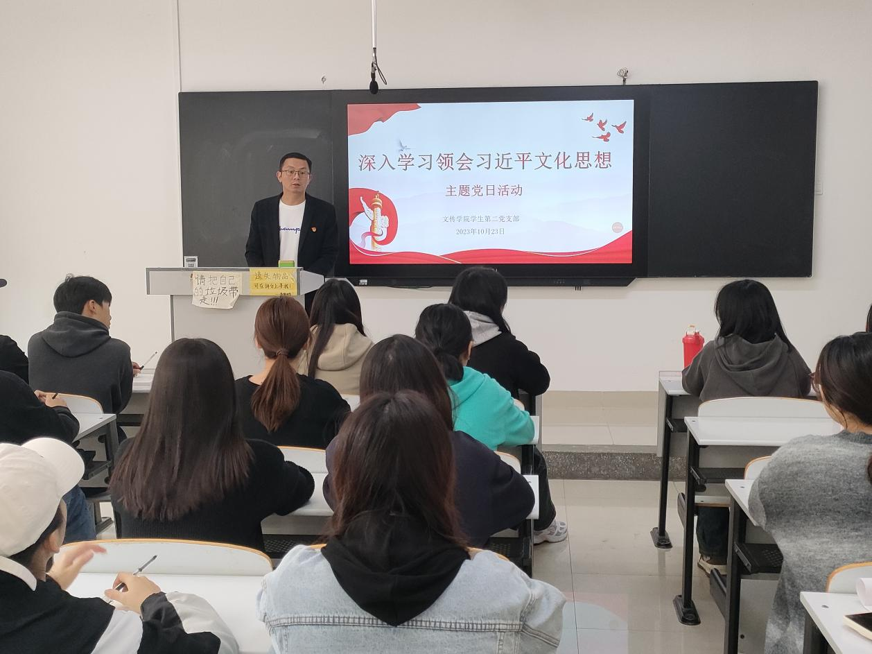 在全国宣传思想文化工作会议上,党中央正式提出并系统阐述了习近平文化思想。为了深入学习习近平总书记在新时代文化建设方面的新思想,深刻领会习近平文化思想在党的宣传思想文化事业发展史上的里程碑意义,深刻理解马克思主义文化理论新内涵。10月23日,文传学院学生第二党支部开展“深入学习领会习近平文化思想”主题党日活动。本次会议由支部书记牛道恒老师主持,全体支部学生党员参加。