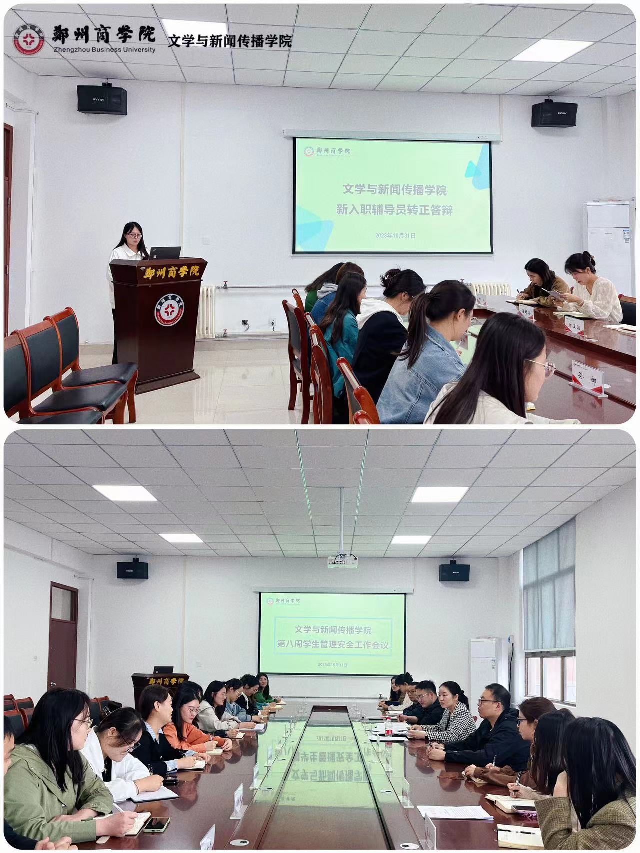 10月31日下午,文传学院召开新入职辅导员转正答辩会暨第八周学生管理安全工作会议,文传学院党委书记贾蓓、团委书记王凯及全体辅导员参会。