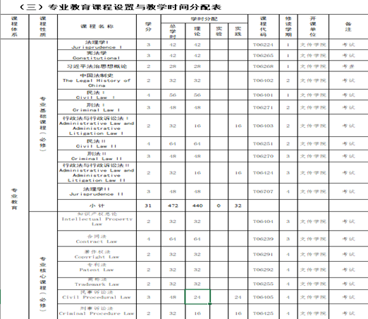 课程设置方面,依据国家法律资格考试的要求,开设了相对应的课程。四大理论法:习近平法治思想概论、法理学、宪法学、中外法制史;四大基本法:民法学、商法学(公司法、破产法、票据法、保险法、证券法等)、刑法学、行政法学;三大诉讼法:民诉法学、刑诉法学、行政诉讼法学;三大国际法:国际公法、国际私法、国际经济法;四大专业核心课程:知识产权总论、专利法、著作权法、商标法;六大实操课程:法律文书写作、计算机基础、知识产权检索与应用,三大诉讼法法律实务。在此基础上,强化提升开设了法理学、宪法学、民法学、刑法学、中国法制史考证课程。将国家法律资格考试课程前置到前五个学期,留给学生一年的准备时间。