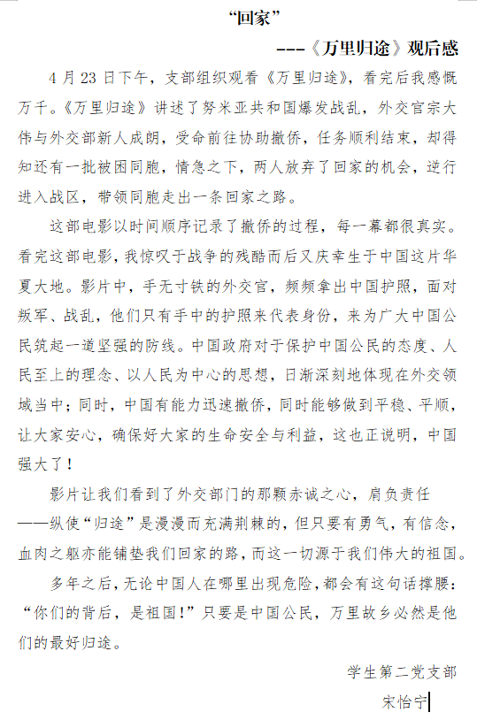 观影过程中,党员同志们被影片中“长大后我也要成为一名外交官”、“感谢党领导下的富强繁荣的祖国,让我们中国人在国外很有安全感”等经典台词所感动,这部电影引发了同志们的共鸣,让大家在故事中深入了解到中国外交官的职责与义务,同时也让党员同志们体会到了作为中华儿女的民族自豪感,以及作为中国公民的安全感。观影结束后,同志们写下了自己的观影感受。