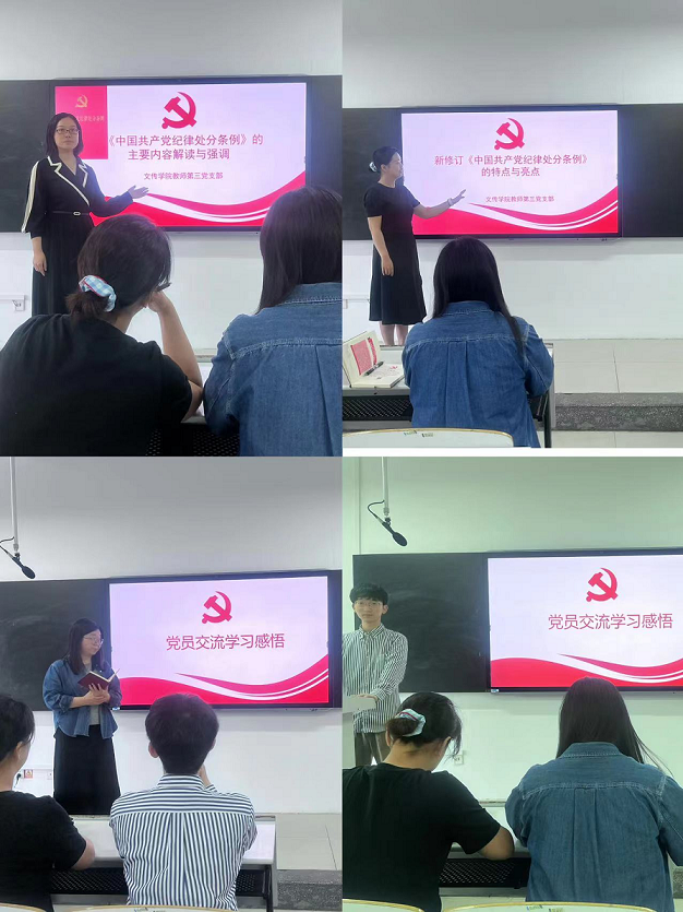 文传学院第三党支部书记翟晓瑞重点对《中国共产党纪律处分条例》的主要内容进行解读与强调。翟晓瑞老师认为中国共产党纪律处分条例是党内法规的重要组成部分,是全面从严治党的重要依据。这部重要的党内法规对于加强党的建设,维护党的团结统一,保持党的先进性和纯洁性具有重要意义。