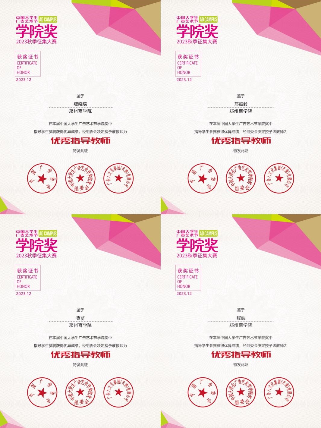 近日,从中国大学生广告艺术节学院奖组委会传来佳讯,我校文传学院学子在学院奖秋季赛中共斩获三等奖1项、优秀奖11项、入围奖26项。参赛团队指导教师翟晓瑞、邢振毅、曹萌、程航荣获“优秀指导教师”称号。