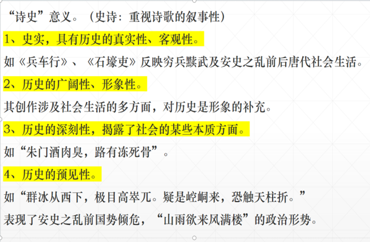 丁老师的课堂教学目标清晰,没有夸夸其谈的概念逻辑,朴素如一清水,是对“润物细无声”的胜境追求,在介绍“诗史”的特征时,老师通过详细讲解杜甫所处的时代背景,让学生们深刻认识到那个动荡不安、风云变幻的历史时期,为理解杜甫诗歌反映社会现实的深度和广度奠定了基础。通过学生熟悉的诗歌举例,让学生总结概括出杜甫诗歌中饱含着“忧心时局,关心黎庶”主题的纪实性诗篇,因此被称为“诗史”,努力把学生拉入《北征》《羌村三首》的文字中,从“柴门鸟雀噪”认识到“儿童尽东征”,从“邻人满墙头”感受到“生还偶然遂”。课堂上,老师通过生动的讲解、精彩的多媒体展示以及互动式的教学环节,让杜甫的诗歌变得鲜活起来。学生们积极参与,热情高涨,他们沉浸在杜甫诗歌的韵味中,感受着诗人笔下的悲欢离合、家国情怀。