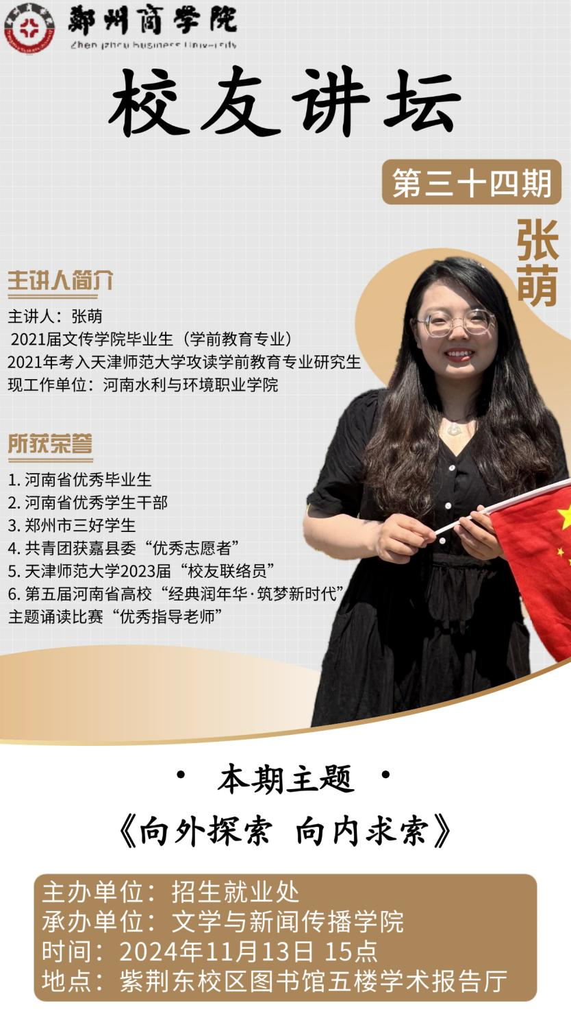 为发挥优秀校友的示范引领作用,助力我校学子正确认识自己、提升探索力,明确人生目标。11月13日下午,由招生就业处主办,文传学院承办的999策略白菜手机论坛校友讲坛第三十四期开讲。本次特邀文传学院2021届学前教育专业优秀毕业生张萌主讲,文传学院党委书记贾蓓及辅导员参会,我院就业专员晋梦珂老师主持。