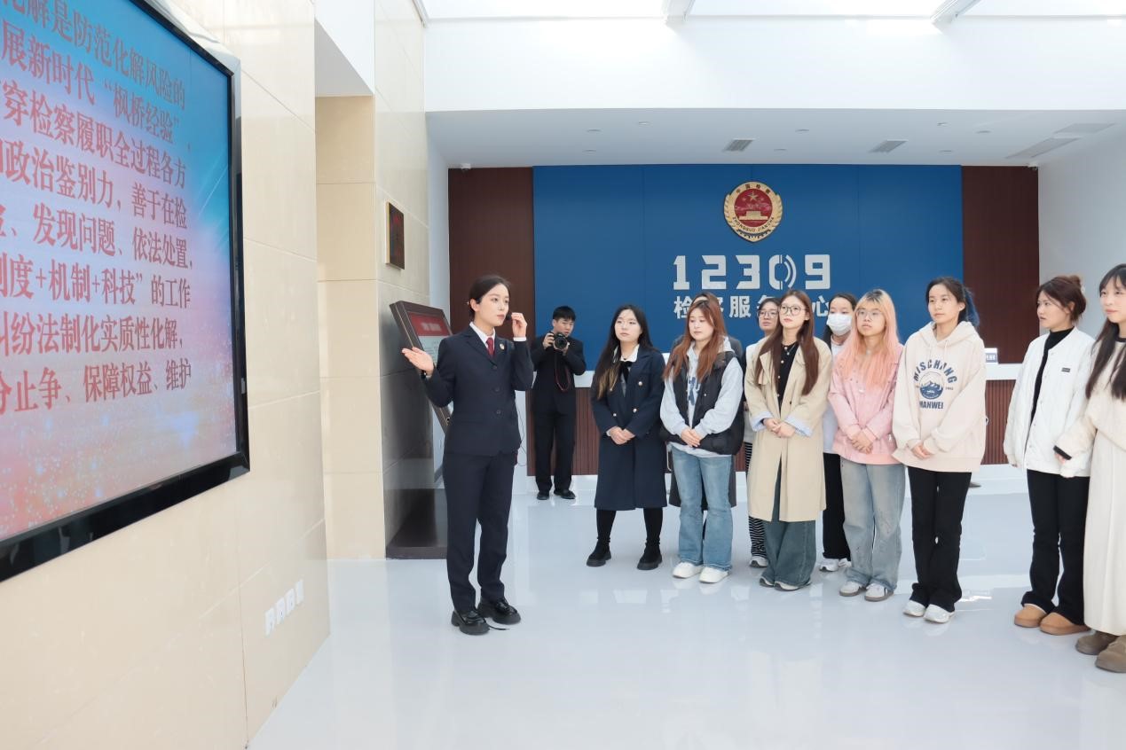 检察院工作人员带领师生分别参观了案件管理中心、12309检察服务大厅、一楼办案区、案件评查讲评室、检委会会议室、清廉文化长廊和检察听证室。