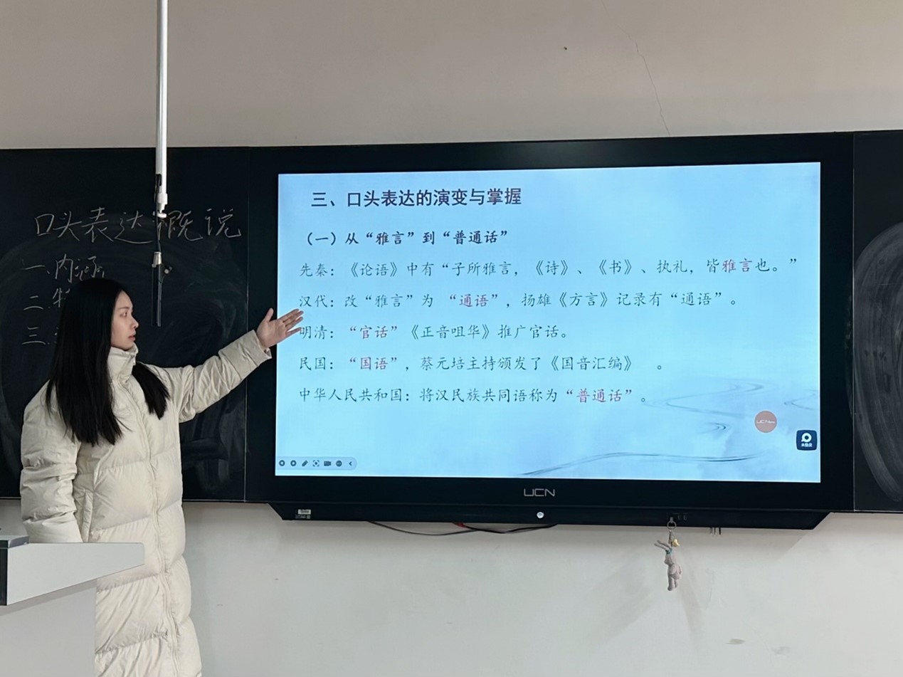 在激发了学生的兴趣后,刘露老师深入系统地讲解了口语表达的内涵和特点、原则与要求方面以及口头表达媒介的演变。刘露老师带领学生回顾了汉民族共同语——普通话的历史演变与发展,通过丰富的史料和趣味的讲解,拓宽了学生对普通话发展的全面认知。在讲解完理论部分后,刘露老师播放了辜鸿铭的演说视频。通过观看视频,学生能够直观地感受到优秀的口语表达所具有的魅力和力量。视频中的辜鸿铭在语速、语调、肢体语言以及表达逻辑等方面都堪称典范,为学生提供了丰富的学习素材。这一多元素材的运用,使学生从理论学习迅速过渡到实际感知,拓宽了学生的视野,让他们明白口语表达在不同场景和文化背景下的多样呈现形式,从而激发学生学习口头表达的动力。