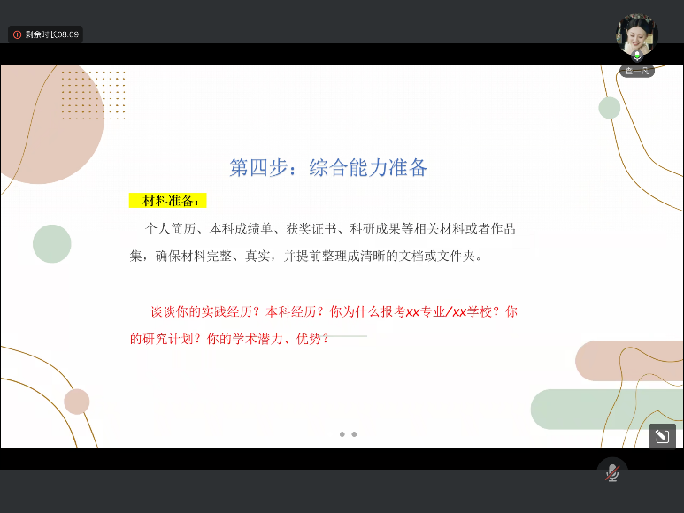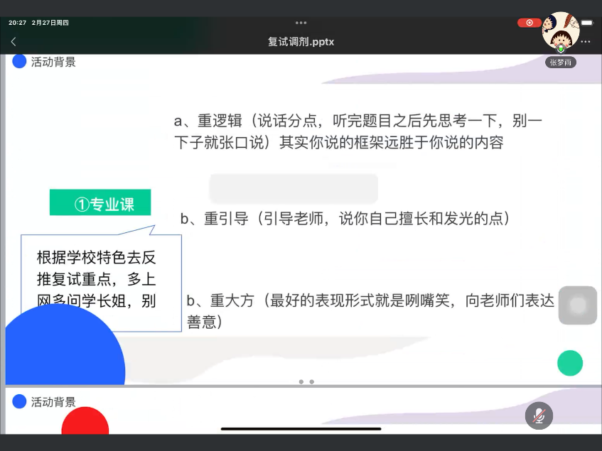 第三步是努力输入专业知识。专业课是复试的核心,同学们需要再次拿起初试时的笔记、思维导图、模拟题等资料,做好复试背诵工作。她还建议同学们每天准备一道论述题并进行录音练习,逐步提高自己的表达能力和思维逻辑。