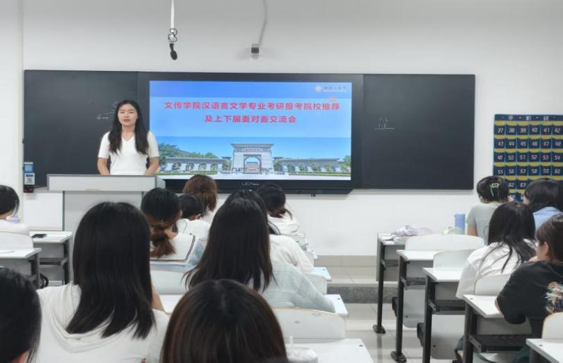 随后,进入经验分享环节。禹月娜老师分析当前汉语言文学专业的考研形势,包括各高校的招生情况、专业优势,解读考研政策,让同学们清晰了解报考条件、考试科目设置等关键信息;结合专业特点,为同学们推荐适合的考研院校与专业方向,从学术研究前景、就业发展趋势等角度给予全面建议。汉语言考研指导老师结合近四年的考研数据,分区域、分专业,系统性地整理出一份2026届汉语言文学专业推荐报考院校名单,根据收集来的考研数据,禹月娜老师为同学们推荐报考院校及专业。在此期间,同学们聆听禹月娜老师的分享,认真记录考研信息。
