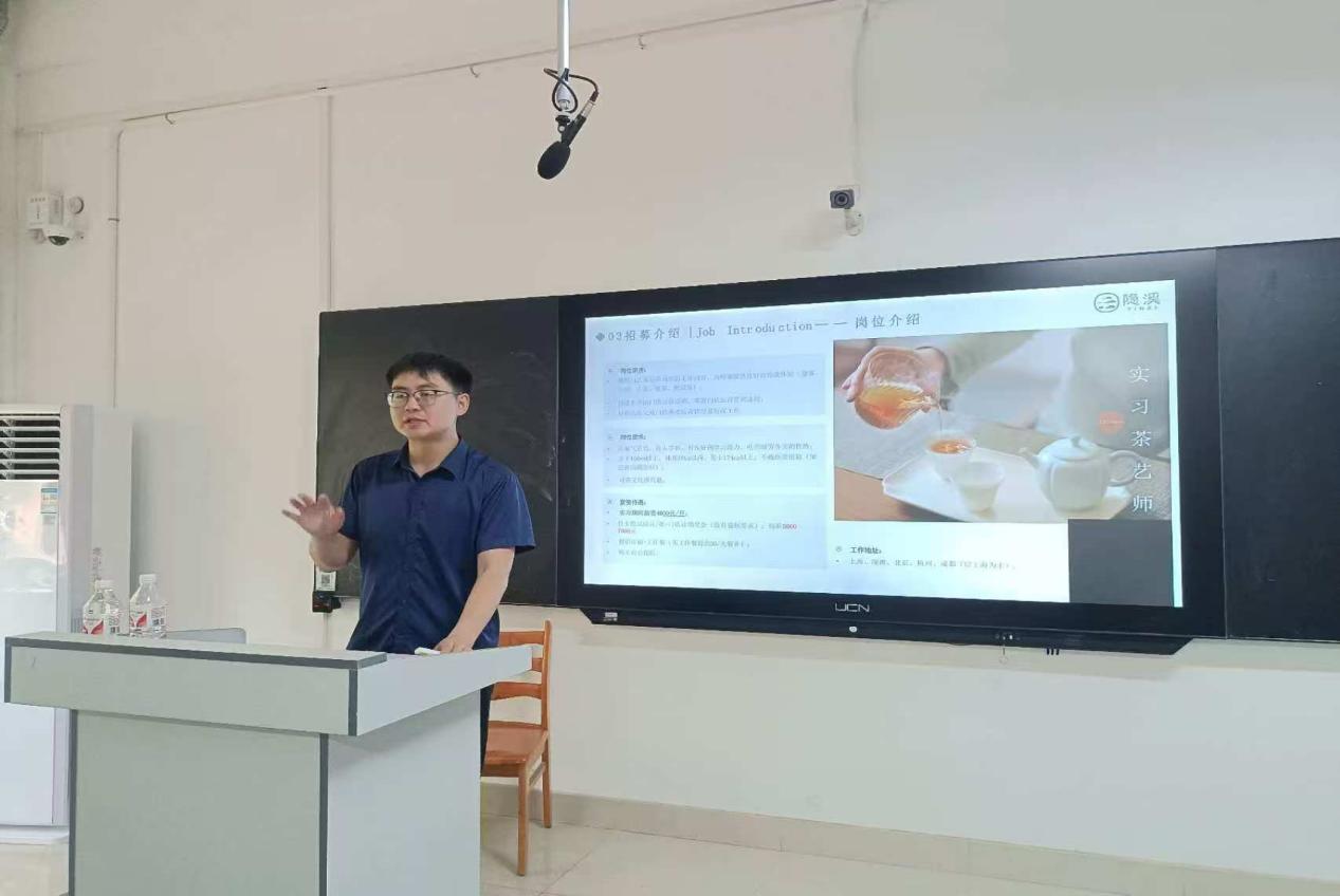 隐溪茶馆品牌负责人对品牌发展历程及茶文化传承脉络进行阐述,结合传统中式美学与现代生活方式,深度解读“静与慢”的精神内核,并围绕“以茶会友,以境养心”的核心理念,详细介绍了融合空间运营、文化体验、定制服务为一体的特色运营模式。随后,品牌负责人给同学们介绍了隐溪茶馆的工作环境、薪资待遇和福利,鼓励同学们到茶馆工作,丰富提升自我,迎接美好未来。