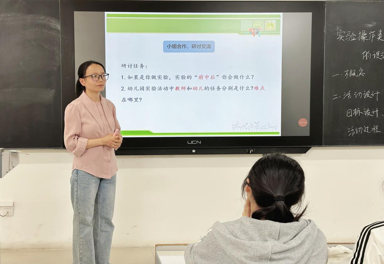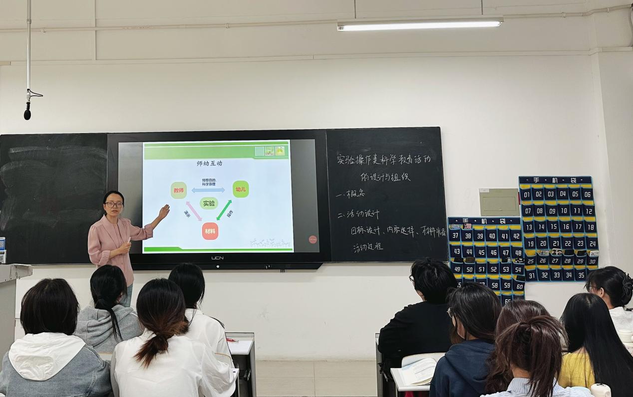 4月16日第三节课,在H308教室,吉宇老师为22学教4B班带来了一堂别开生面的《学前儿童科学教育与活动指导》课。围绕“实验操作类科学活动的教学设计和组织”这一教学核心,吉老师突破传统讲授式的藩篱,精心构建“理论-实践-反思”教学模式。课堂上,吉老师运用问题驱动方式,抛出“实验前中后具体任务如何设计”等关键问题,引导学生小组讨论。学生们各抒己见,在思维的碰撞中,对实验操作类活动的认知不断得以深化。讨论结束后课堂随即转换,学生化身“幼儿教师”,模拟幼儿园科学教学活动。最后,通过教师点评、学生互评、小组自评等多元评价反馈方式,全面复盘课堂学习成果。