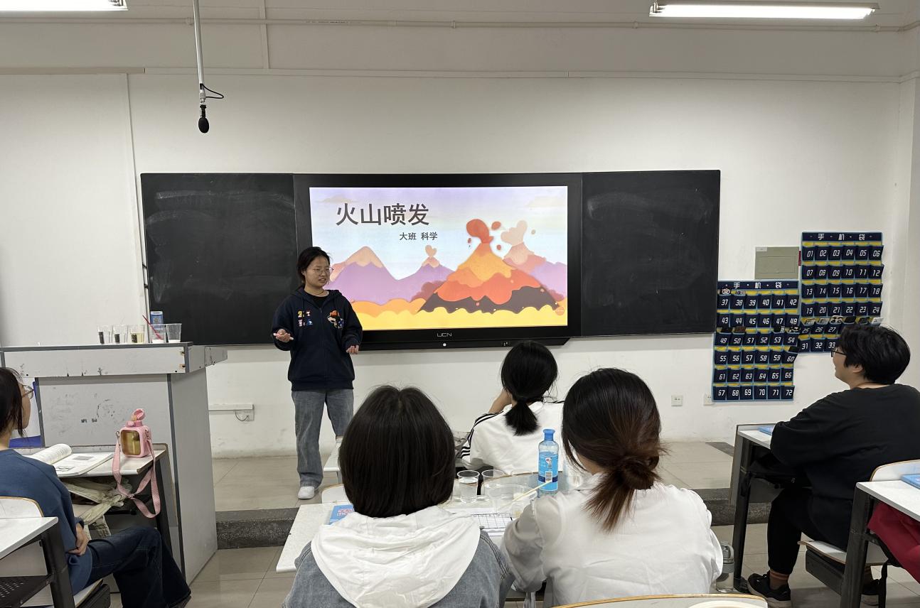 讲课过程中,吉老师设置“火山喷发”小实验的教学情境,通过“材料选择-问题设置-引导策略-安全规范”的问题链,驱动学生进行教学设计。在模拟教学环节,学生以小组为单位开展微型课展示,通过角色扮演体验教师与幼儿的双重视角。这种沉浸式学习使理论认知与实践操作形成良性互动,有效解决了传统教学中理论与实践脱节的难题。