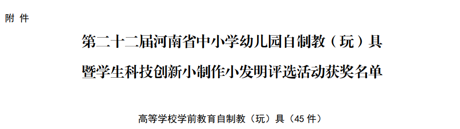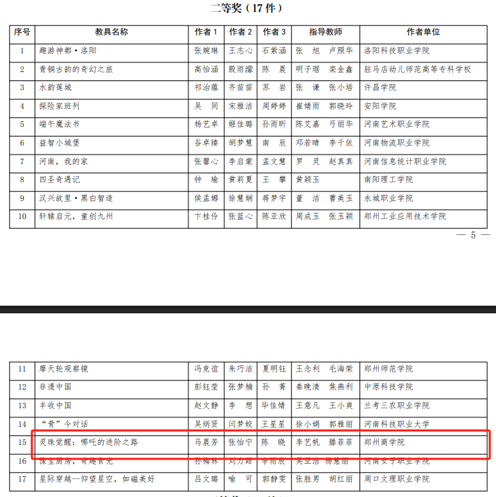 5月29日,由河南省教育厅主办的第二十一届河南省中小学幼儿园自制教(玩)具暨学生科技创新小制作小发明评选活动评选结果揭晓,由文传学院选送的作品《灵珠觉醒:哪吒的进阶之路》脱颖而出,荣获高等学校学前教育自制教(玩)具二等奖。