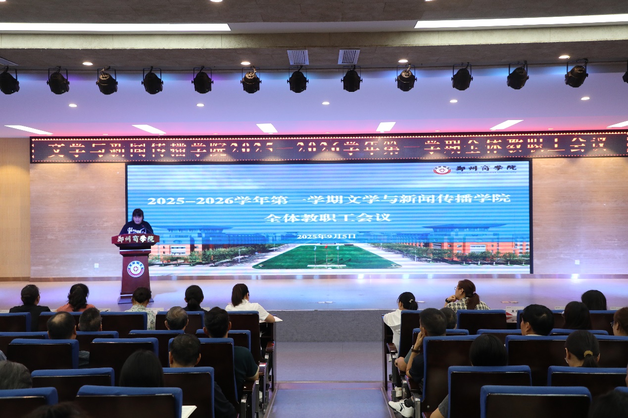 2025年9月5日,文传学院在自力楼三楼报告厅召开2025-2026学年第一学期期初全体教职工大会,全面部署新学期各项工作。学院全体教职工参加会议,会议由教学秘书刘洋主持。