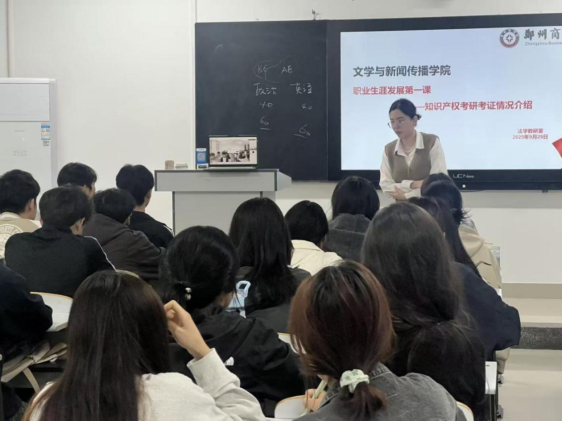 聚焦新生关注的考研与法考,教研室安排邀请王继风教授与考研考证教研室主任孟亚娣老师开展专题宣讲。王继风教授以往届学子的职业发展案例为切入点,通过详实的数据展示了往届知识产权专业学生在国家统一法律职业资格考试中的优异成绩,用学长学姐成功拿证的鲜活案例,为新生树立职业准备的榜样,激发其学习动力。