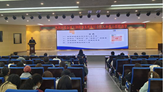 程果主任首先向在场师生详细介绍了孙保山律师的专业背景与行业履历——孙主任深耕法律领域多年,拥有丰富的执业经验与深厚的专业积淀,在合规业务、人才培养等领域成果显著,同时作为金博大律所核心成员,对法律人才成长路径有着深刻洞察。