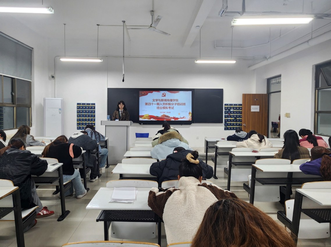 为检验入党积极分子阶段性学习成效,强化理论武装,严明学习纪律,11月6日18时,文传学院党委顺利组织第41期入党积极分子开展结业考试模拟考。学院党委书记贾蓓、组织委员程斯佳一同巡考。