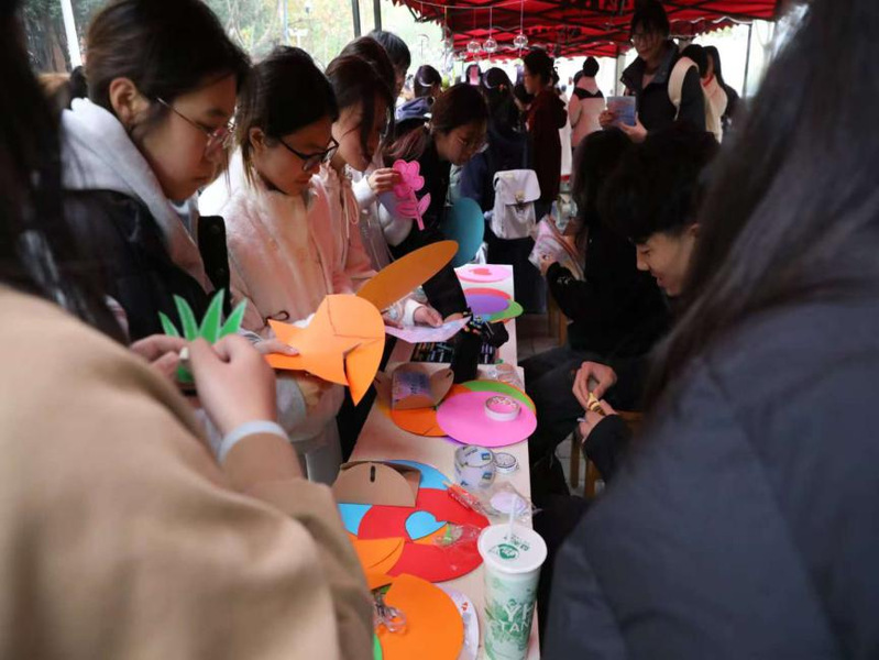 秋日微风下,师生们执笔在素雅卡片上静静书写下内心的烦恼与期许,将其系于廊下的风铃装置。活动现场特设的“解忧回音区”内,许多人在陌生的卡片前驻足,留下“请相信你的勇敢”“前方有光”等真挚鼓励,让文字成为连接心灵的桥梁,传递着深切的心理支持。活动中,大家在艺术创作中抒发内心思绪,在集体协作中感受联结的力量。