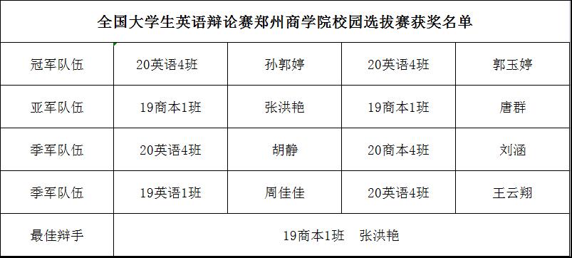 比赛最终决出校园选拔赛冠军队伍1支、亚军队伍1支、季军队伍2支,最佳辩手1名,其中冠军队伍将代表我校参加4月份举行的全国大学生英语辩论赛华西地区赛。获奖名单如下: