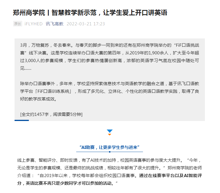 我校立足于“商科、应用型、国际化”的人才培养目标,坚持探索信息技术与英语教学的融合,基于讯飞口语教学平台,进行翻转课堂、混合式教学实践,助力打造大学英语口语金课,形成了多元化、立体化、个性化的英语口语教学实践,取得了良好的教学改革成效。3月21日,讯飞高教从“AI助赛,让更多学生参与进来”、“AI助教,让学生主动思考与表达”、“AI助研,推动大学英语教学方法改革”等,对我校大学英语智慧教学进行公众号推文报道。