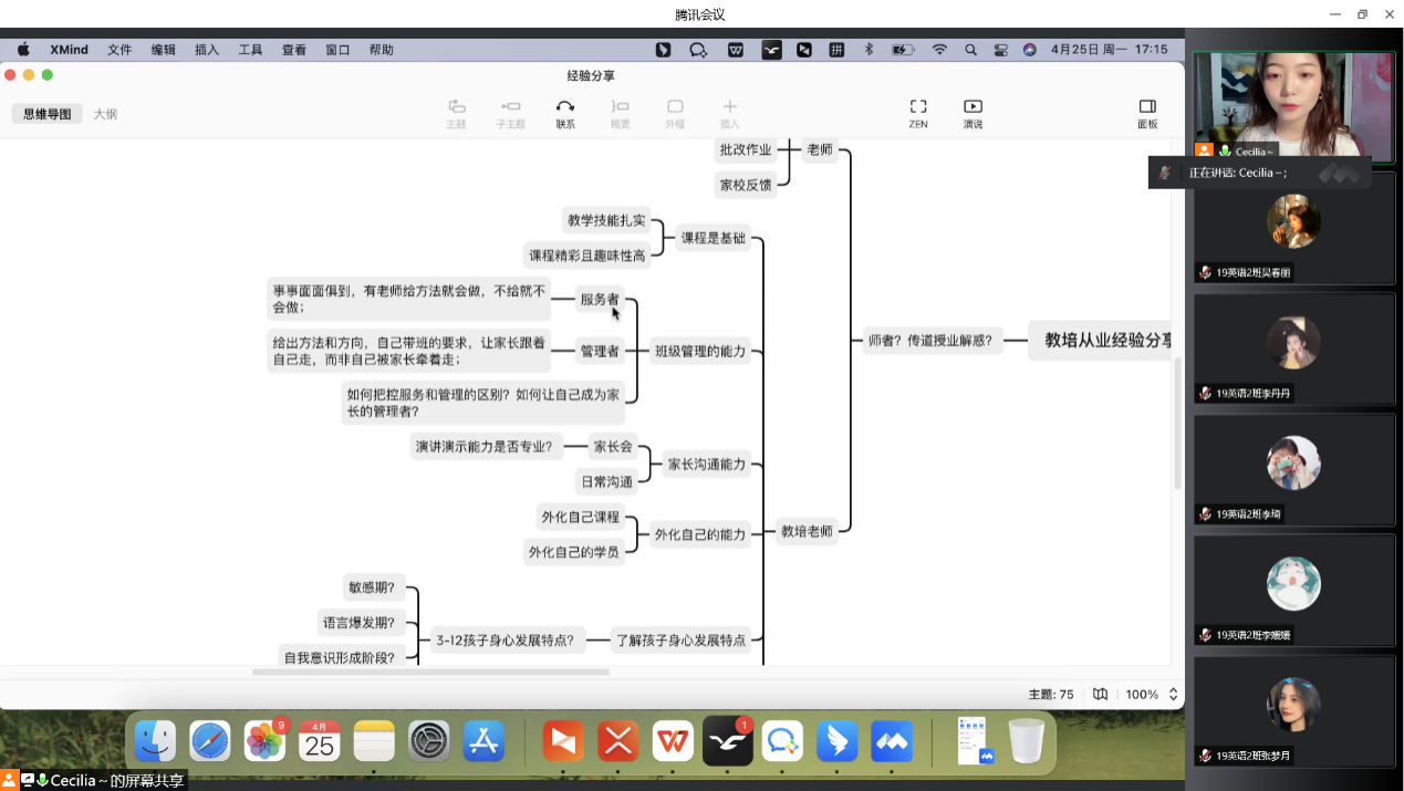 随后,学姐以“如何择业”为重点,以自己的择业经验为出发点,从兴趣、性格、人生规划等方面分享了择业的一些经验和看法。在与同学们互动的过程中,王老师以自己在教培行业多年的工作经验为基础,为大家介绍并解释了作为一名培训师需要具备哪些能力,以及如何培养提升自己的优势。耐心讲解了教培行业择业的重点和难点,并详细诉说了自己对“教师”这一职业的看法,引导同学们在择业的时候要全方位多方面的考虑,为自己负责,也是为企业负责。