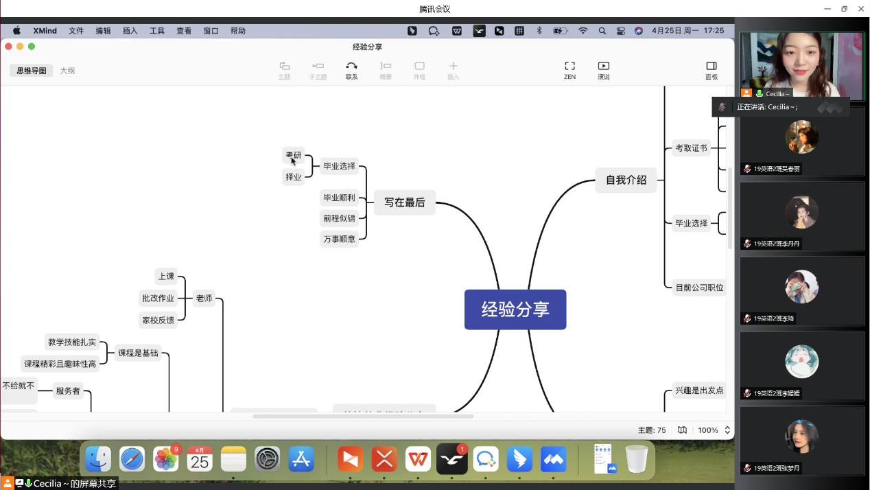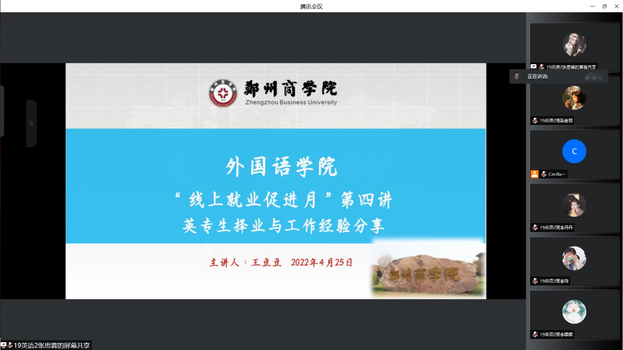 为了进一步贯彻落实学校关于推进大学生高质量就业工作的部署要求,提高我院就业创业工作水平,发挥优秀毕业生的典范和榜样作用,帮助在校生有效树立职业规划目标,提升人才培养质量。4月25日下午,由招生就业处主办,外语学院承办的校友讲坛第六期,通过腾讯在线会议顺利举办。本期主讲人邀请的是我院2019届英语专业优秀毕业生王豆豆,她分享的主题为“英专生择业及工作经验分享”,我院2019级英语专业、翻译专业共同参与了此次活动。