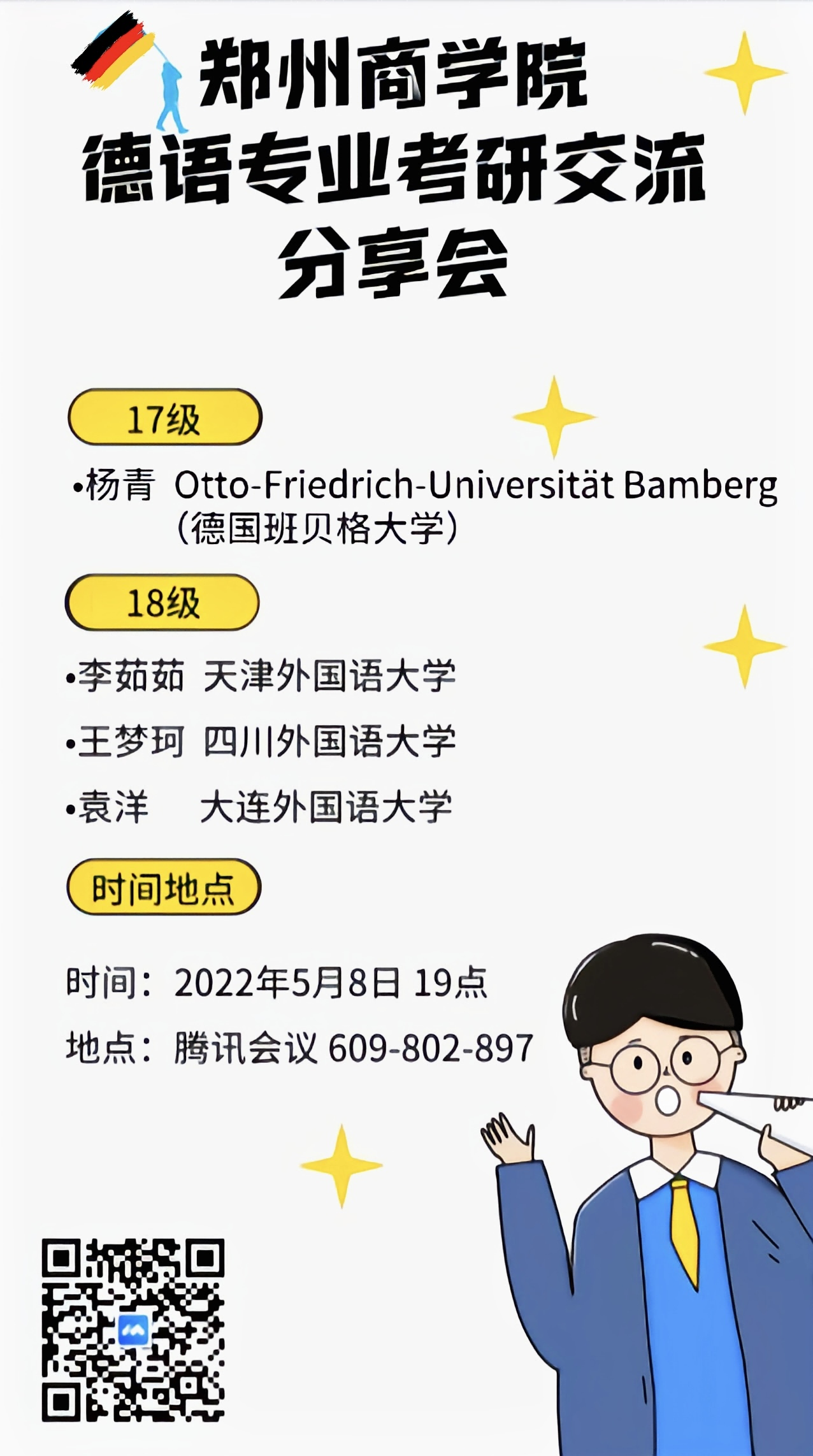 为了增加学生对考研的认识,调动学生考研积极性,5月8日19:00德语专业考研交流分享会以线上直播形式如期举行。本次分享会由外国语学院德语专业举办,此次分享会邀请了我院德语专业17、18级考研成功的学姐为学弟学妹们分享考研经验、解答疑惑,他们分别是杨青(Otto-Friedrich-Universität Bamberg德国班贝格大学)、李茹茹(天津外国语大学)、王梦珂(四川外国语大学)、袁洋(大连外国语大学)。