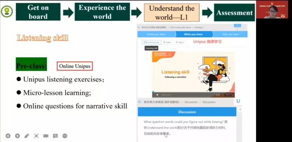 我院大学英语教研室教师宣菡静、尤宇以《转变教师角色培养多元能力》为题,以我校使用《新未来大学英语》视听说教材进行线上线下混合式教学案例为依托,聚焦教材中的多元文化呈现和多元能力培养,围绕产出任务设计教学思路,结合混合式教学步骤分享了课程设计经验,并获得了《新未来大学英语》课程团队优创奖的荣誉称号。