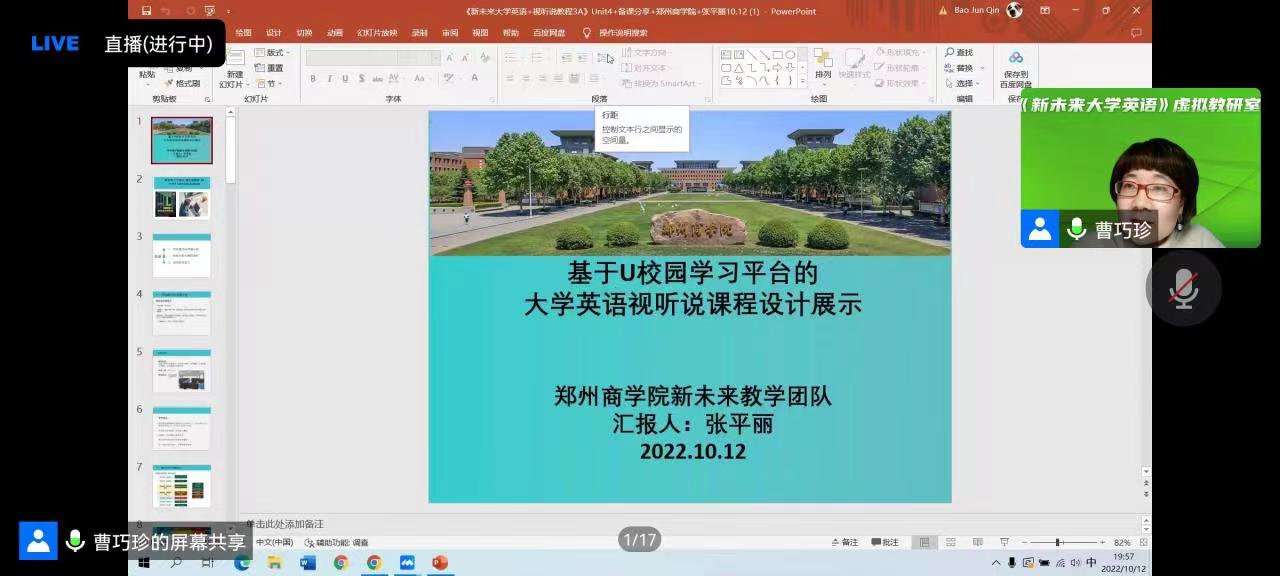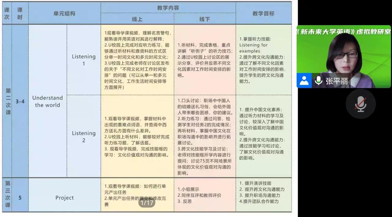 10月12日晚19:00,外研社《新未来大学英语》虚拟教研室系列活动第三期直播于腾讯会议线上平台举办。本期研修班主题为“《新未来大学英语视听说教程》产出任务教学设计与多元能力融合培养”。我院《新未来大学英语》课程团队有幸受邀,张平丽老师作为团队代表,分享教学建议与经验成果,与云端近200名教师共同探索教学新思路。