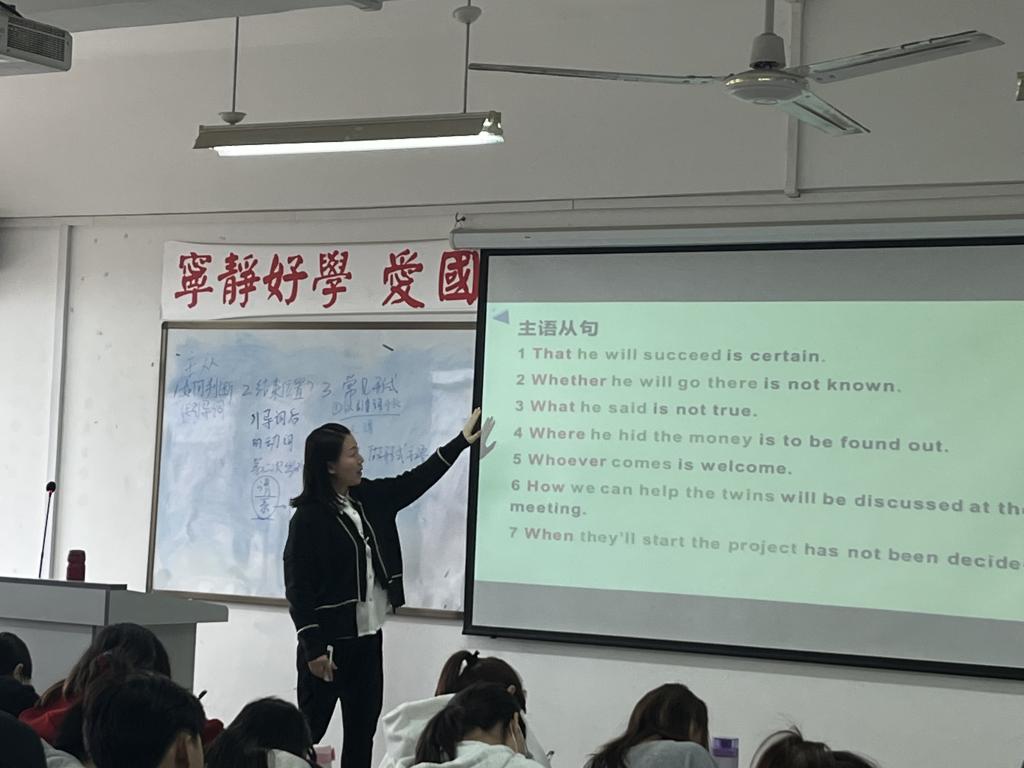 在语法讲解阶段,王静老师重点讲授了名词性从句,王老师将这一部分内容设计成提问、讨论和讲解答疑三个环节来进行,课堂上,王老师和学生通过互问互答,获取信息和梳理知识体系,学生的认真倾听和积极互动给听课老师留下了深刻印象。