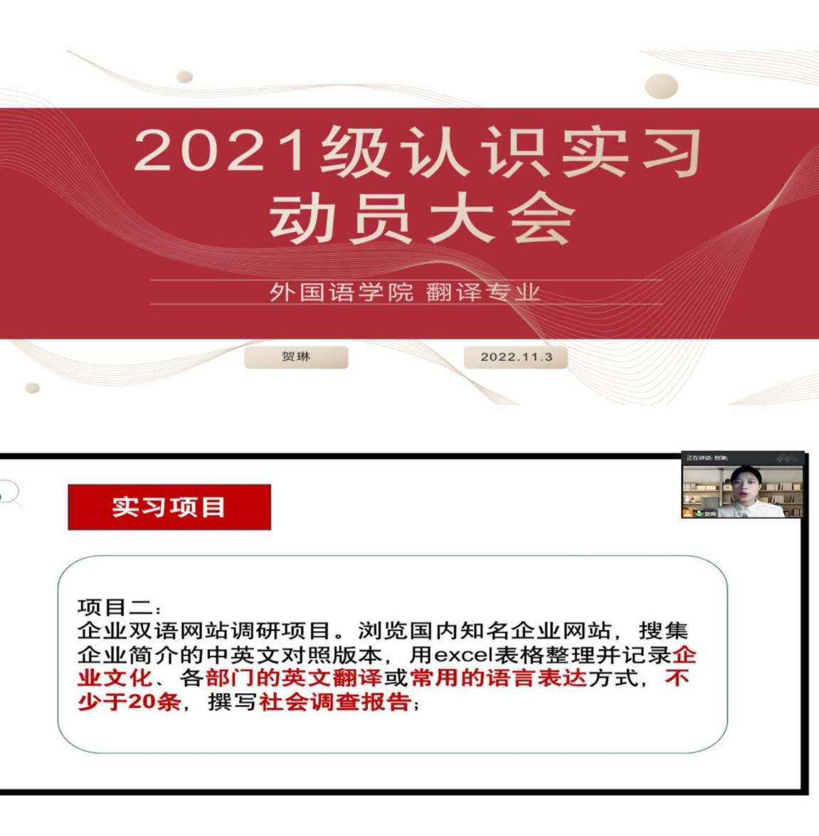 11月3日下午,21级翻译专业认识实习启动会以线上形式顺利召开。翻译专业教研室主任郜万伟、实习指导教师贺琳以及21级翻译专业全体学生参加了本次启动大会。
