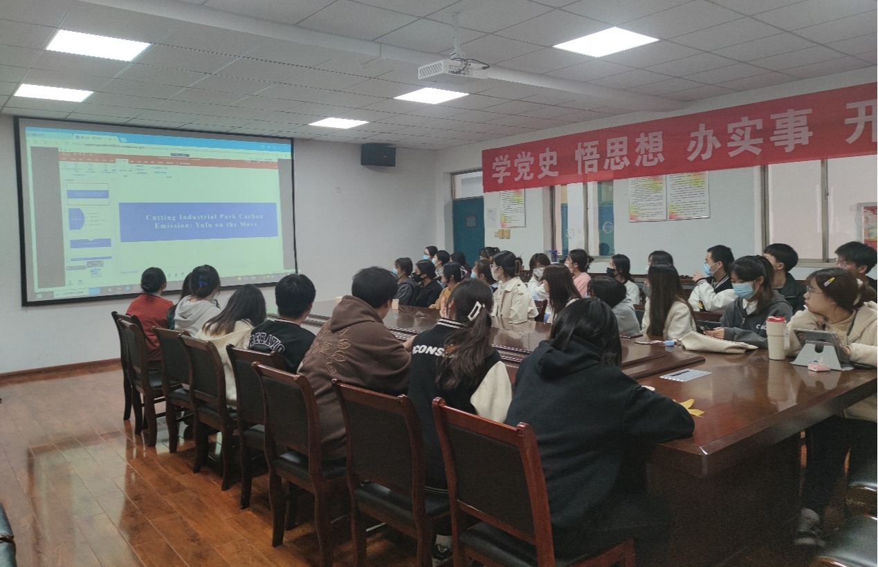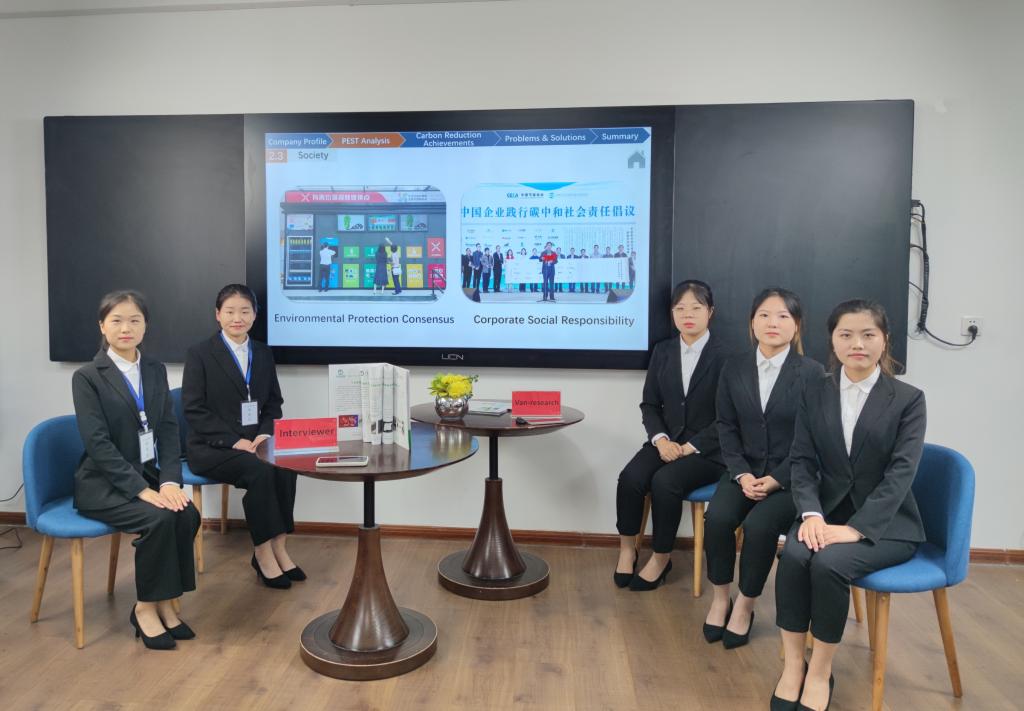 本次比赛以线上形式进行,分为云平台测试和主题演讲两个比赛环节。云平台测试重点考核学生英语语言技能、国贸实务操作技能及跨学科综合知识应用能力;主题演讲要求参赛队伍依据指定的竞赛主题分工合作完成英文主题演讲。比赛前期,商务英语教研室“实践大赛智囊团”结合本届大赛“双碳”主题,对学生提出的调研方案进行了讨论,最终选定“巩义市泛锐熠辉复合材料有限公司”为调研对象,并于11月5日下午通过线上访谈完成了对泛锐熠辉公司的调研,潘广镇博士应邀参与并为同学们讲解了泛锐熠辉对实现“双碳”贡献的力量。
