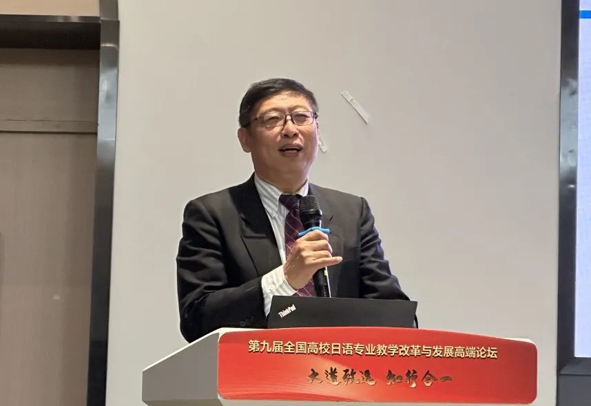 主旨报告环节中,教育部高等学校外国语言文学类专业教学指导委员会副主任委员、天津外国语大学修刚教授以“服务国家战略,创新外语教育——新时代日语专业教育的新使命”为题做主旨报告,并指出,新时代的日语教育要适应新文科、高等教育普及的新形势,满足立德树人、传播中国声音的新需求,培养具有家国情怀、国际视野的特色日语人才。