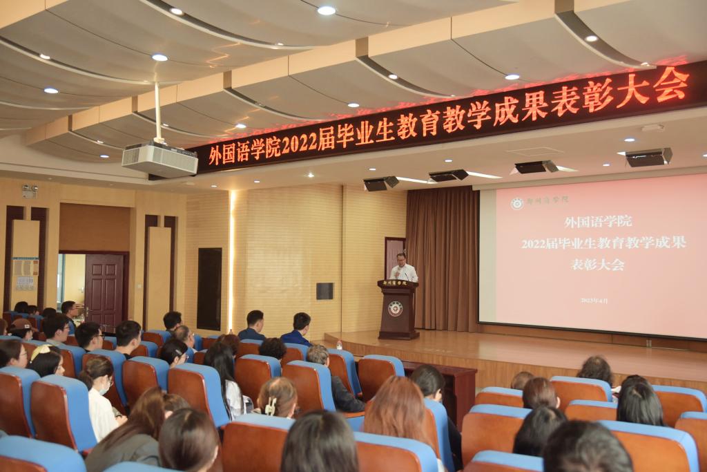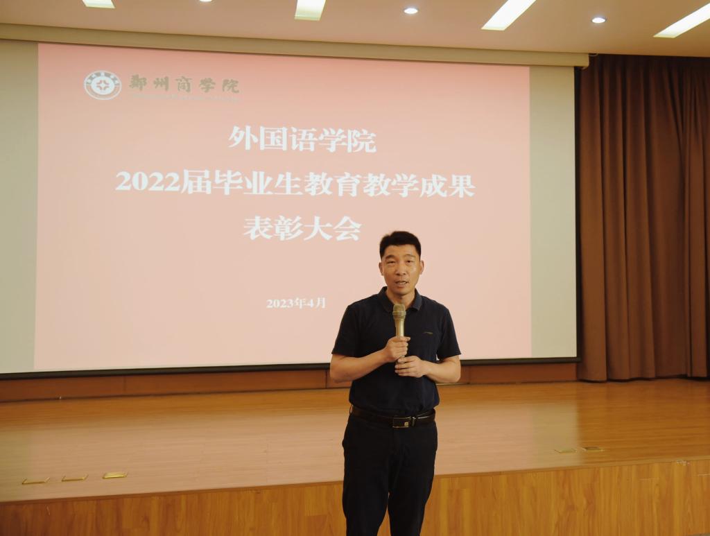 会上,邱院长宣读《外国语学院关于表彰2022届毕业生教育教学成果的决定》,奖项包括实习实训专项奖、大学英语考研考证指标奖、外语专业考研专项奖和先进个人奖。与会校领导分别为先进集体和先进个人颁奖。翻译专业教研室主任郜万伟老师和商务英语教研室郑静静老师分别作了典型发言。