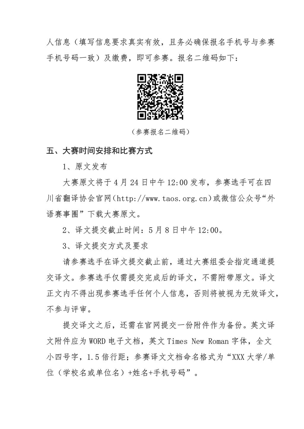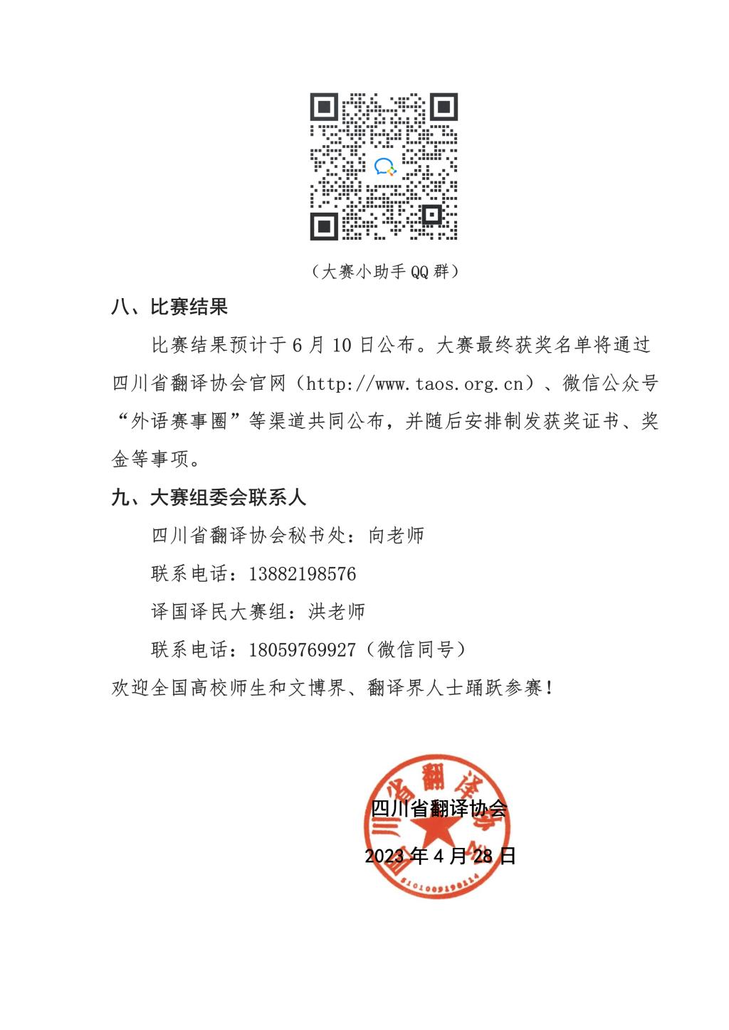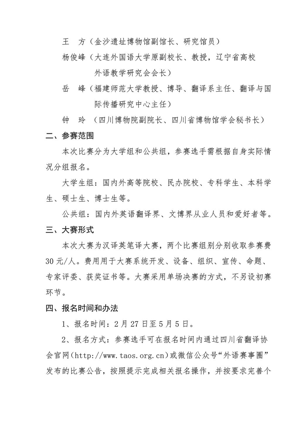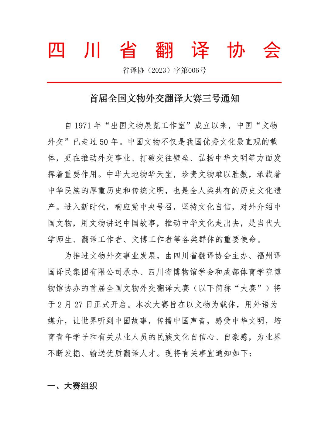 为推进文物外交事业发展,由四川省翻译协会主办、福州译国译民集团有限公司承办、我院参与协办的首届全国文物外交翻译大赛(以下简称“大赛”)于2月27日正式开启(截止日期为5月5日)。本次大赛旨在以文物为载体,以外语为媒介,让世界听到中国故事,传播中国声音,感受中华文明,培育青年学子和有关从业人员的民族文化自信心、自豪感,为业界不断发掘、输送优质翻译人才。现将有关事宜通知如下:
