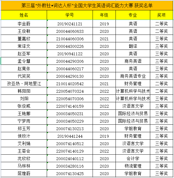 5月16日,2023年第三届“外教社•词达人杯”全国大学生英语词汇能力大赛组委会公布了本届大赛省赛(河南赛区)的获奖名单。经校级初赛选拔,我校获得省赛资格的考生共有143人,其中英语专业学生39人,非英语专业学生104人。经过激烈的角逐,我校英语专业组8名同学分别荣获省级二、三等奖,非英语专业组12名同学分别荣获省级二、三等奖。获奖名单如下: