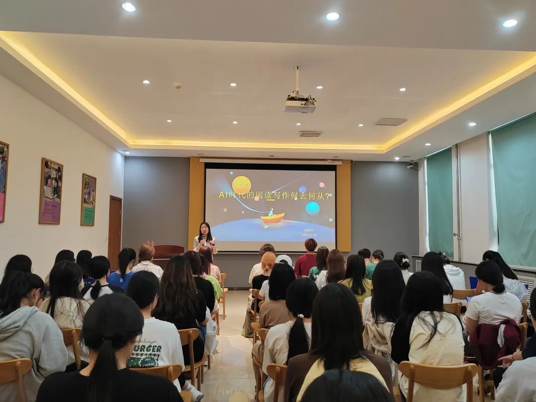 讲座伊始,张晓宁老师围绕AI的“发展史”、“挑战与机遇”、“AI的辅助阅读”、“AI的辅助写作”这四个方面为我们讲述了AI时代下的阅读与写作何去何从。随后,张晓宁老师表示,随着计算机技术的不断发展,人工智能技术也越来越成熟,应用范围也越来越广泛。AI技术的快速发展和广泛应用对阅读和写作带来了新的挑战和机遇。尽管如此,AI与写作缺一不可,二者在当今社会下处于相辅相成的关系,AI是写作的“得力助手”,写作为AI增强情感化。接着,张晓宁老师给同学们的写作介绍了几种AI工具的用法,以便同学们更好的写作。最后,张晓宁主任就相关AI与写作的探索推荐了《新闻采访者探寻AI 足迹》、《AI研究者与从业者的跨文化思考》、《英国商业人士的AI简易解读》等五种书目,以此鼓励同学们进行阅读与思考。