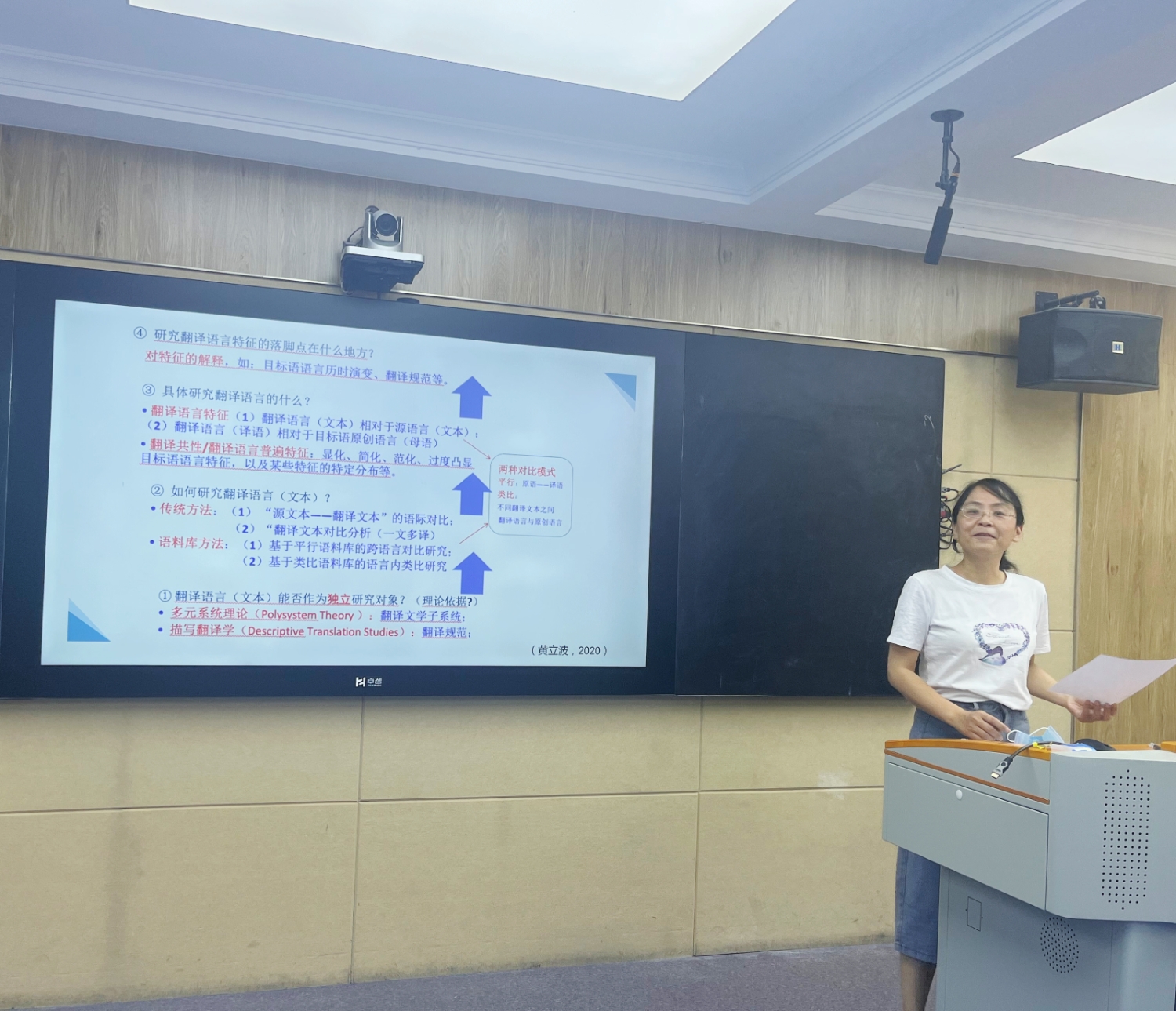 宣菡静老师首先对语料库翻译学的缘起以及研究思路进行了综述,分析了语料库翻译学的理论基础,研究方法和研究路径等。贺琳老师针对研讨会的主旨发言做了转述和研讨,并以自己创建的杜甫诗英译平行语料库为例,展示了杜甫诗多译本的语言形式参数,如类符形符比、平均句长、词汇密度等,从不同角度分析了杜甫诗英译在译入译出方向上呈现出的差异。