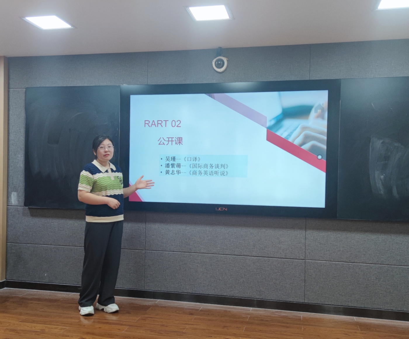 段田园老师对此次教学开放周的公开课环节进行了汇报。段田园老师首先汇报了西南财经大学外国语学院吴瑾老师的公开课“口译中的视译技巧”。吴老师围绕Fast conversion(快速转化)、Sight interpreting(视译)、Simulation in simultaneous mode(同声传译模拟)三个部分,结合党的二十大报告,按照词、句、语篇逐层推进,讲练结合。接着段老师汇报了荣获第十二届“外教社杯”全国高校外语教学大赛全国总冠军特等奖的潘紫萌老师讲授的《国际商务谈判》公开课。潘老师运用案例式、任务式、启发式教学法,在介绍了谈判策略和技巧后,以2021国家医保药品准入谈判作为案例,带领同学们总结该谈判中所使用的谈判策略、谈判用语的同时,引导学生关注双方使用的谈判礼仪、面部表情以及身体语言,引发同学们关注谈判的目的以及思考为什么要分毛必争。随后让学生分组模拟比亚迪公司和美国LBT的谈判,锻炼学生的谈判策略的使用以及谈判语言、礼仪等的综合运用,并进行现场点评;黄志华老师的《商务英语听说》公开课以中国式现代化为切入点,采用了任务式教学法,在进行词汇和语篇输入之后,让学生现场模拟华为、联想、北斗导航科技、比亚迪等公司的产品发布会,并要求学生在产品介绍时体现人与自然和谐共生的中国式现代化理念。段田园老师围绕几位老师的课程设计、敬业精神、数字化素养、专业能力发表了自己的心得感悟,指出自己与国家一流本科专业的教师相比的不足之处和未来努力的方向,与参会老师共勉。