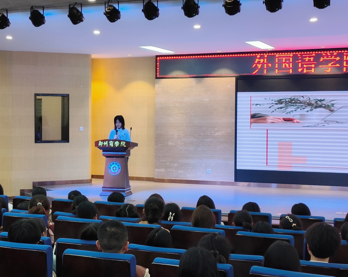 然后,优秀学生代表21级英语1班王皓琨同学向新生分享学习经验。第一,新生应把握好专业课的学习,积极参加各种比赛,以便明确学习目标。第二,积极付出行动。把功夫用在平时,认真对待每一堂课,完成每一项作业。第三,学会自我调节。找到合适的压力排解方法,劳逸结合。最后,她引用经济学家薛兆丰的讲话,激励学弟学妹们为自己的简历“打工”,不断丰富自我、突破自我。