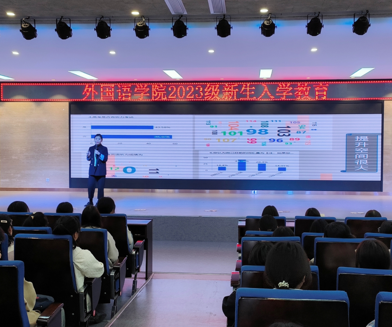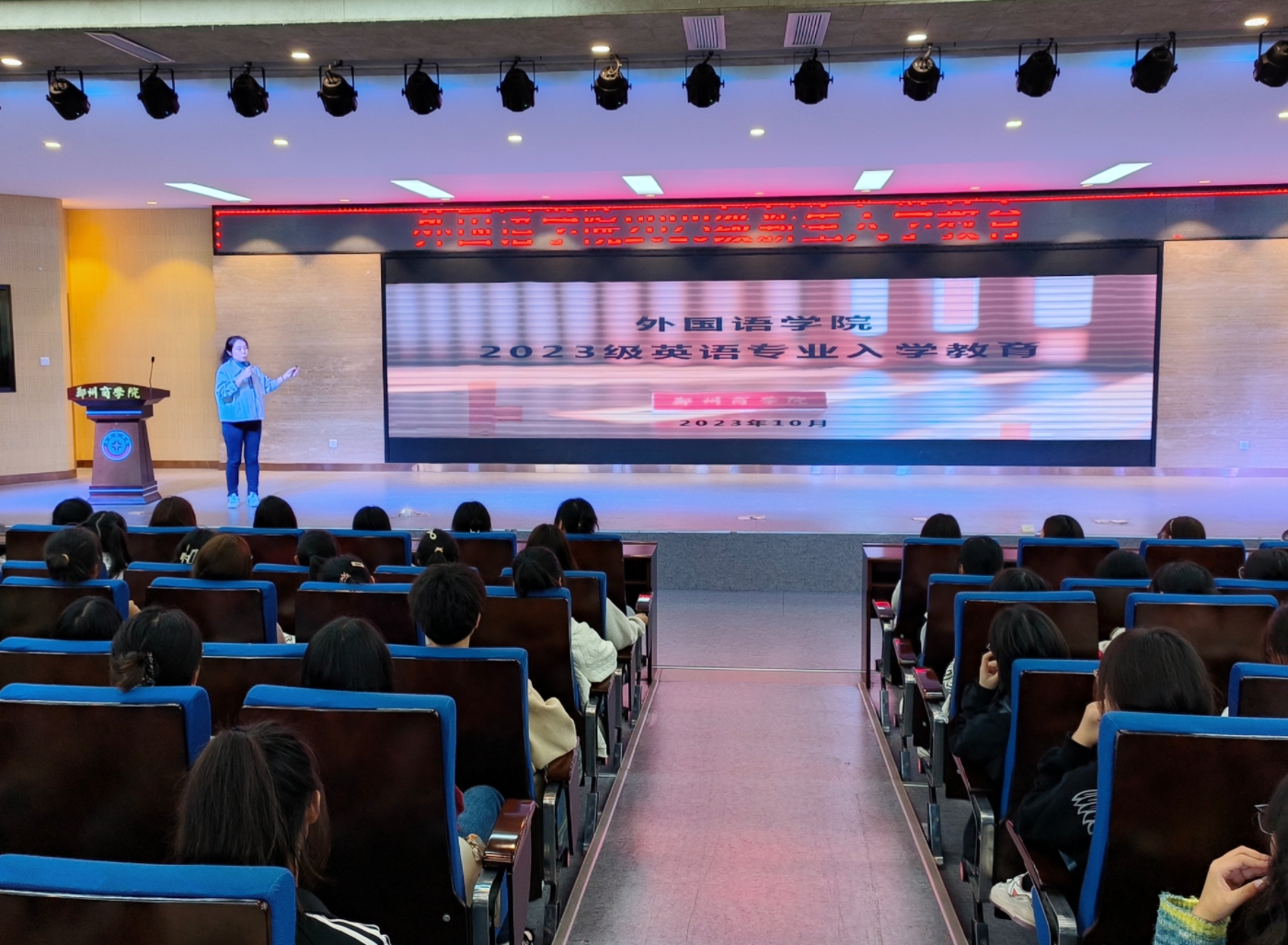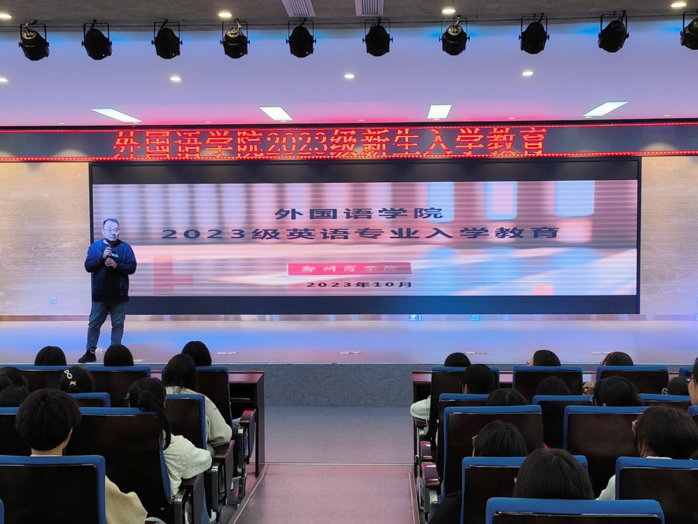 2023年10月8日下午,我院英语专业在西区自立大楼开展2023级新生入学教育。本次会议由英语专业教研室主任程玮老师主持,院长邱培磊、英语教研室教师代表及2023级英语专业全体新生参加了此次会议。本次入学教育对新生的大学生活与学习进行整体介绍,旨在帮助新生做好人生规划,尽快适应大学生活和学习。