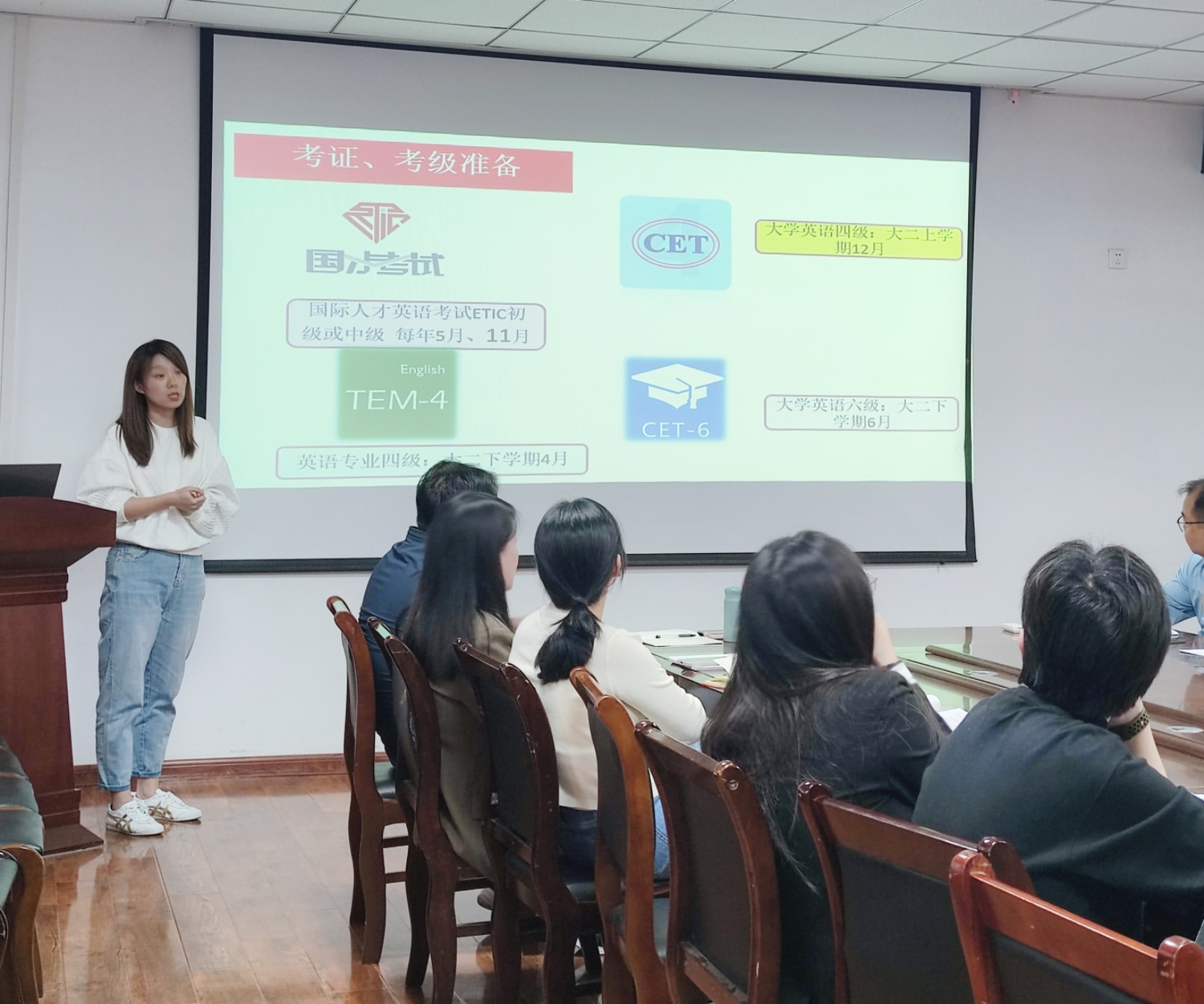 随后,商务英语专业教研室的张姗姗老师与英语专业教研室的刘亚琴老师分享了她们对于“强基”教学的经验。张姗姗老师认为教学成果离不开每个团队成员的辛苦付出,团队成员心往一处想、劲往一处使,精心设计出一整套学习方案,精准地从单词、阅读、翻译、写作等各个方面抓起,坚持寒暑假不断线,才能有今天的教学成果。刘亚琴老师强调基础教学团队要激发学生的内驱力、要注重教与学的过程、要协同合作,共同夯实学生的语言基础。
