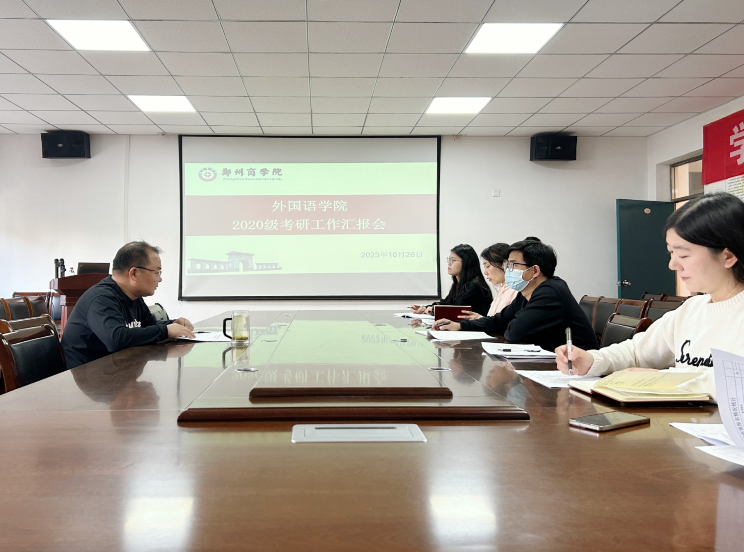 2023年10月26日,我院2020级考研工作汇报会在外语楼W209举行。我院院长邱培磊、英语专业教研室主任程玮、商务英语教研室主任葛莹辉、翻译专业教研室主任郜万伟以及各位考研指导老师参会,会议由邱院长主持。