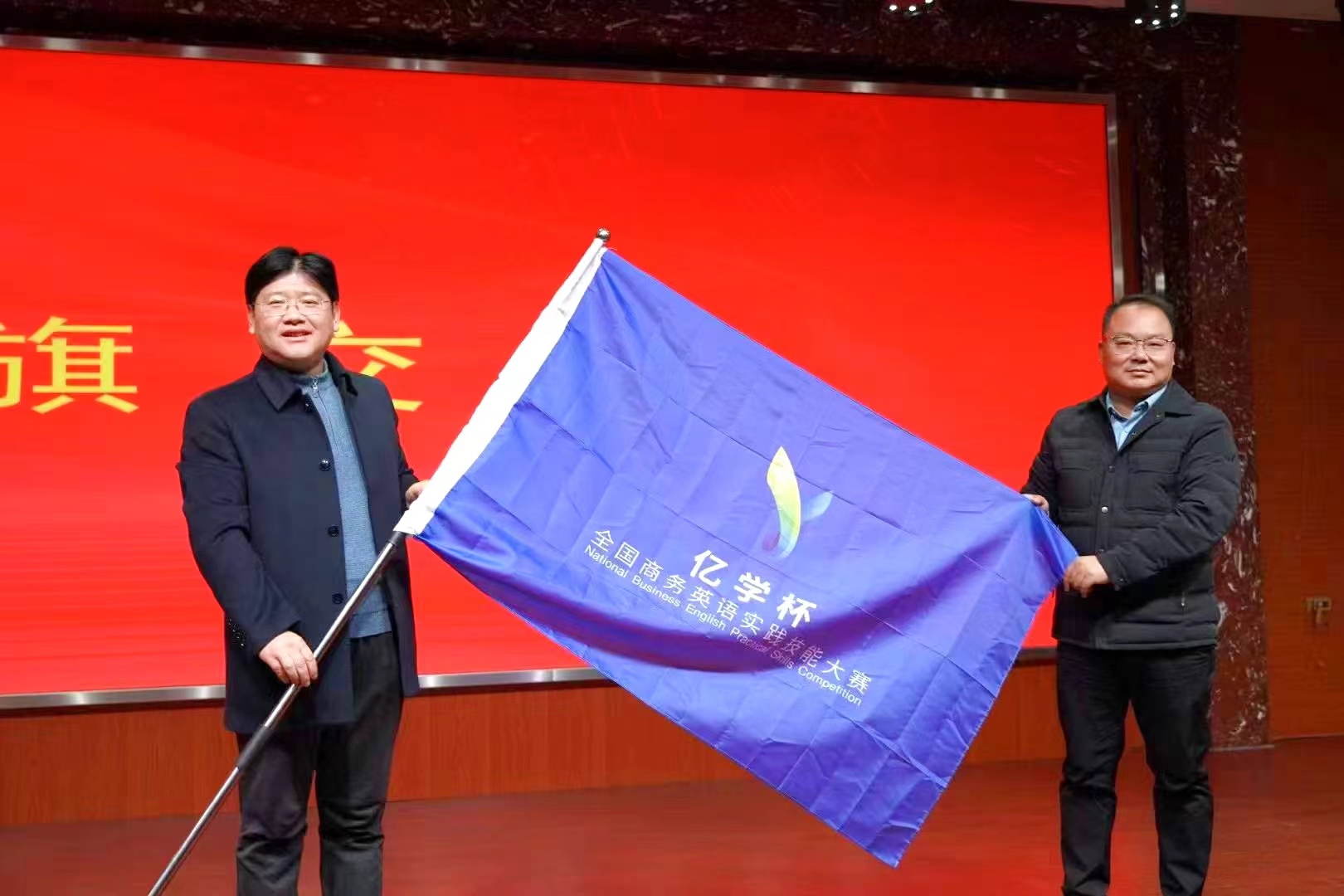 闭幕式上,大赛组委会宣布我校获得2024年第八届“亿学杯”全国商务英语实践技能大赛本科组全国总决赛举办权。邱院长上台接旗并发表讲话,向全国四十多所高校发出邀请,期待明年相聚郑商、各展风采。